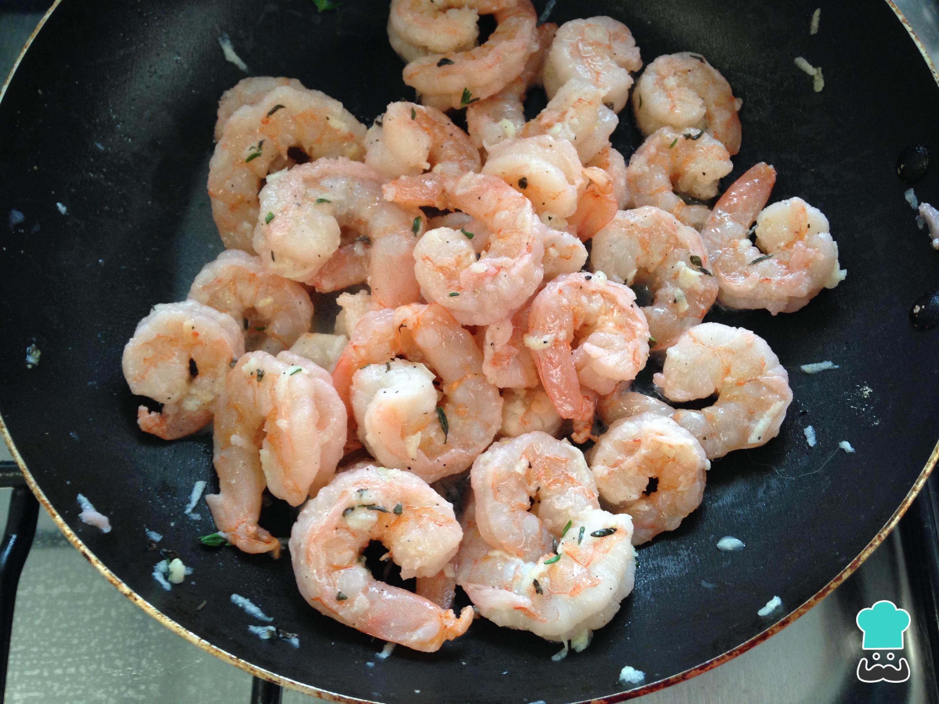 En una sarten bien caliente y con un poco de aceite salteamos el ajo previamente picado finamente y agregamos las gambas sin cascaras ni cabeza ni cola, cocinamos durante 3 minutos, agregamos sal, el tomillo y la pimienta al gusto y reservamos.