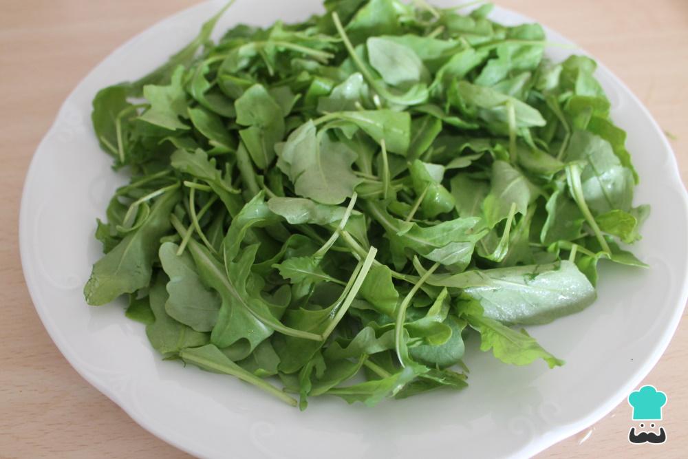 Ahora sí, empieza con la ensalada. Pon en el plato que vayas a usar para servirla, o una ensaladera, la rúcula repartida por todo el plato, previamente lavada y desinfectada. No te pierdas nuestro artículo en el que te explicamos Cómo desinfectar verduras.