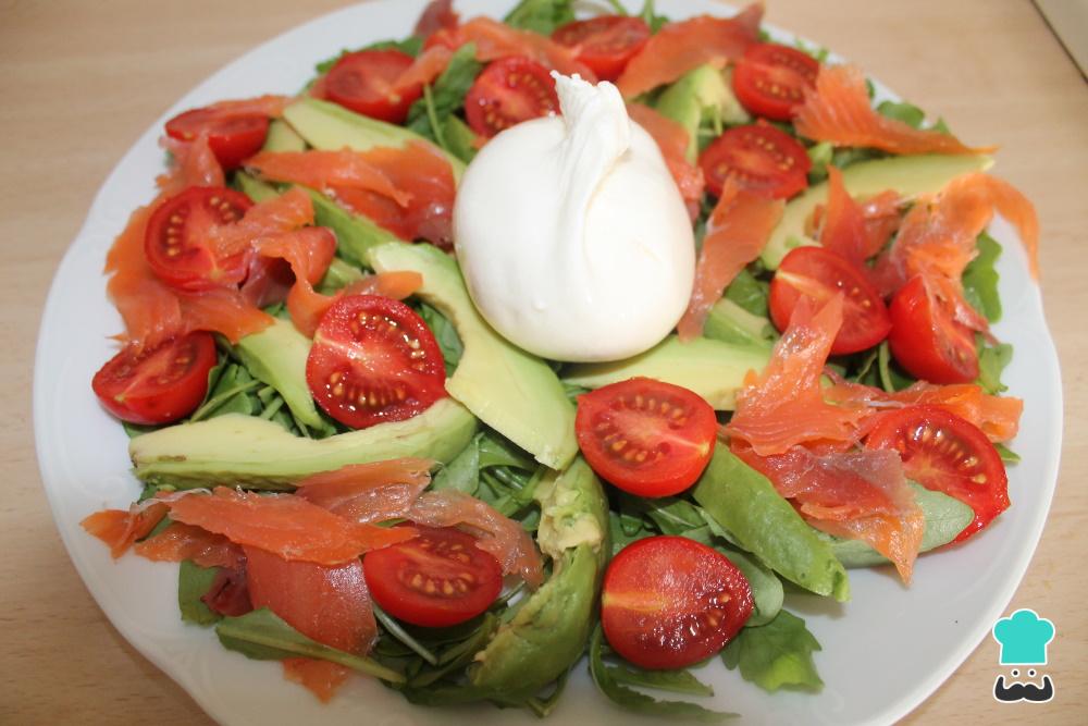 Trocea el salmón ahumado y distribúyelo por la ensalada. Retira la burrata de su líquido de conservación y ponla en el medio de la ensalada.