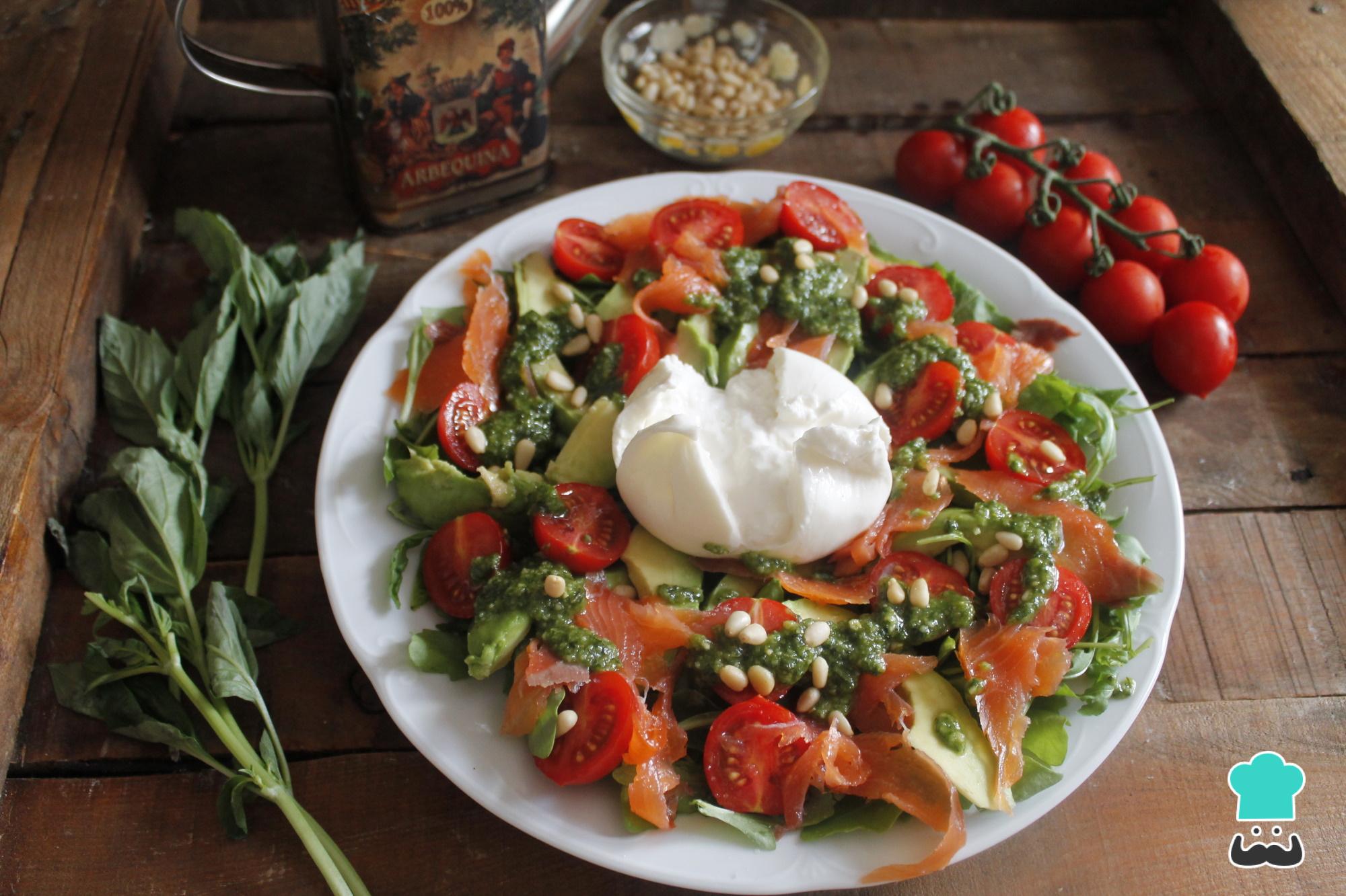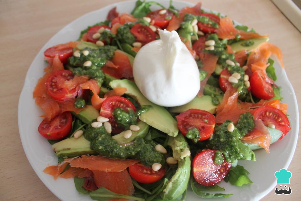 A la hora de servir la ensalada, trocea la burrata y mézclala con todos los ingredientes. ¡Lista! Como ves, la receta de ensalada de burrata italiana con rúcula, aguacate, tomate y pesto es muy sencilla y rápida de hacer. Cuéntanos en los comentarios tu opinión y comparte con nosotros una fotografía del resultado final.
