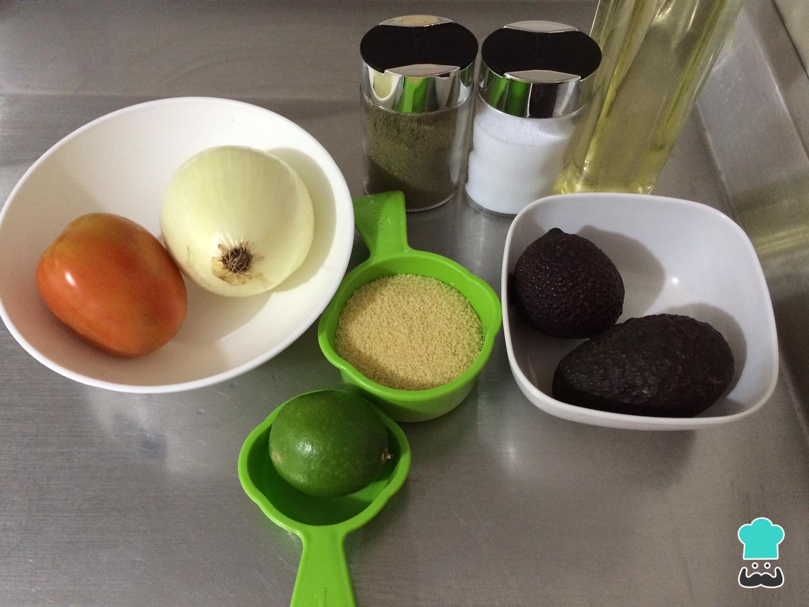 Antes de realizar la ensalada de cuscús y aguacate, el primer paso es alistar todos los ingredientes. Recuerda que siempre repetimos este paso porque será mucho más fácil empezar a cocinar si tenemos organizados todos los materiales que necesitaremos.