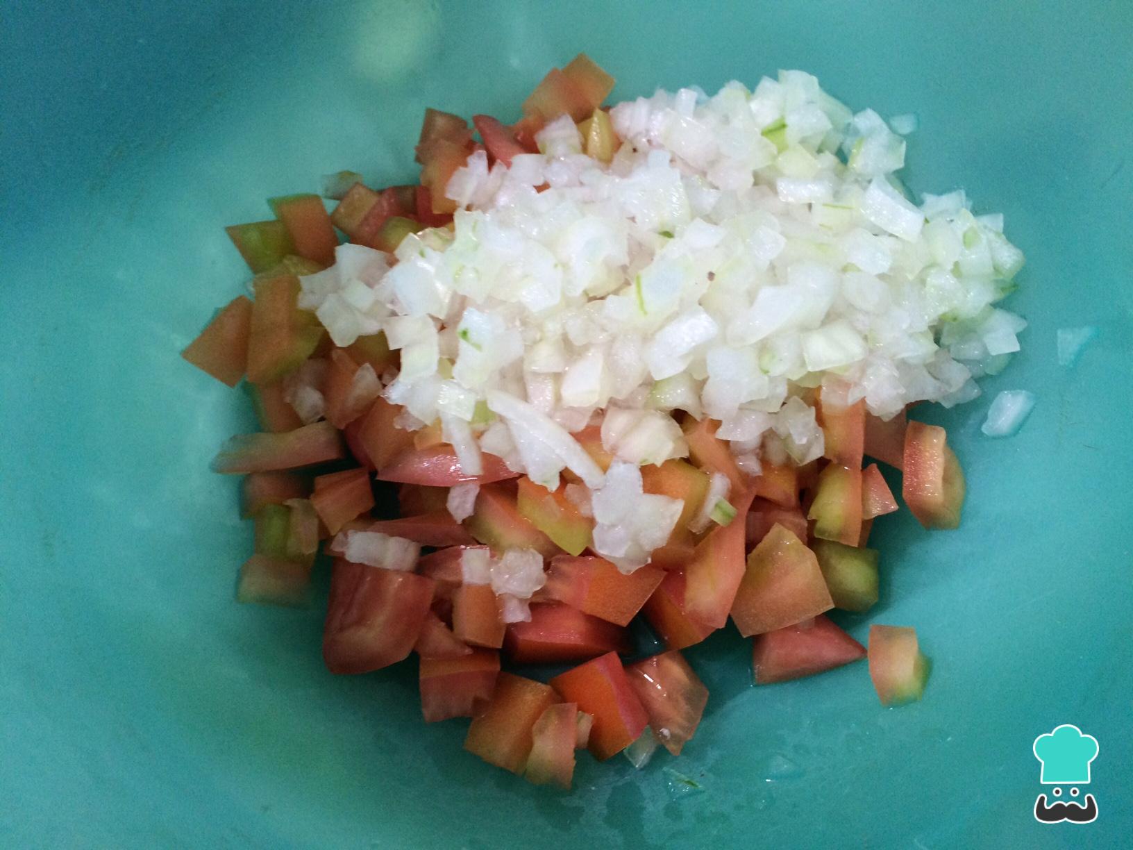 Aparte, mezclar la cebolla y el tomate sin semillas, todo cortado en cubos pequeños.