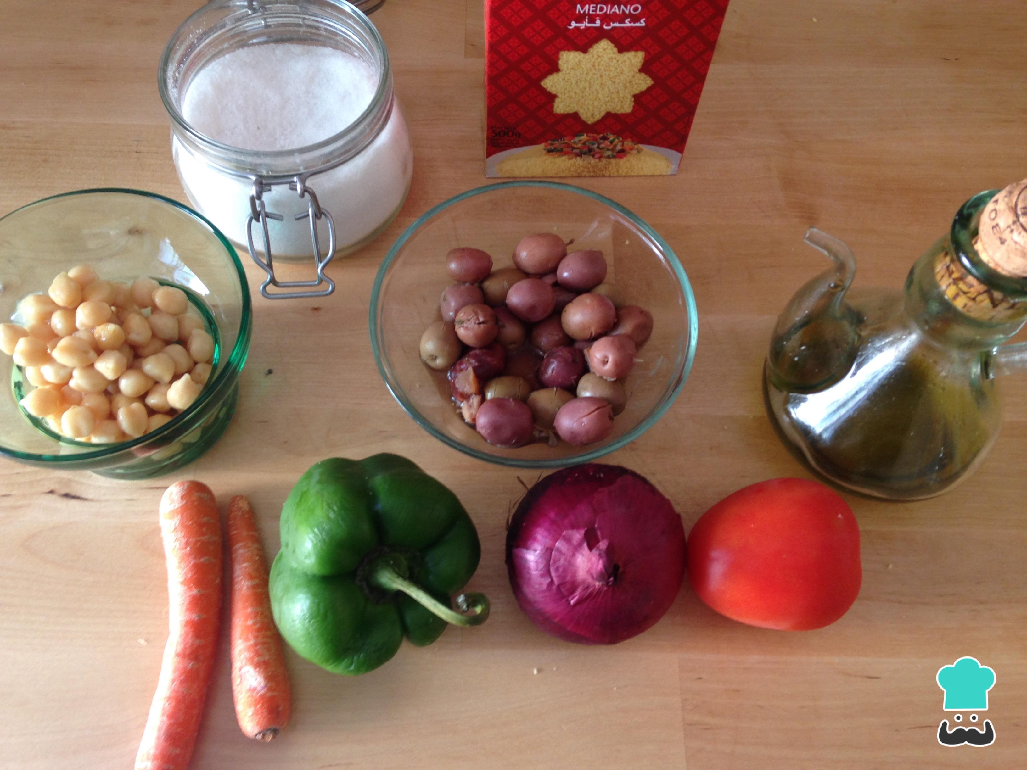 Reunimos todos los ingredientes para elaborar la ensalada de cuscús y garbanzos.
