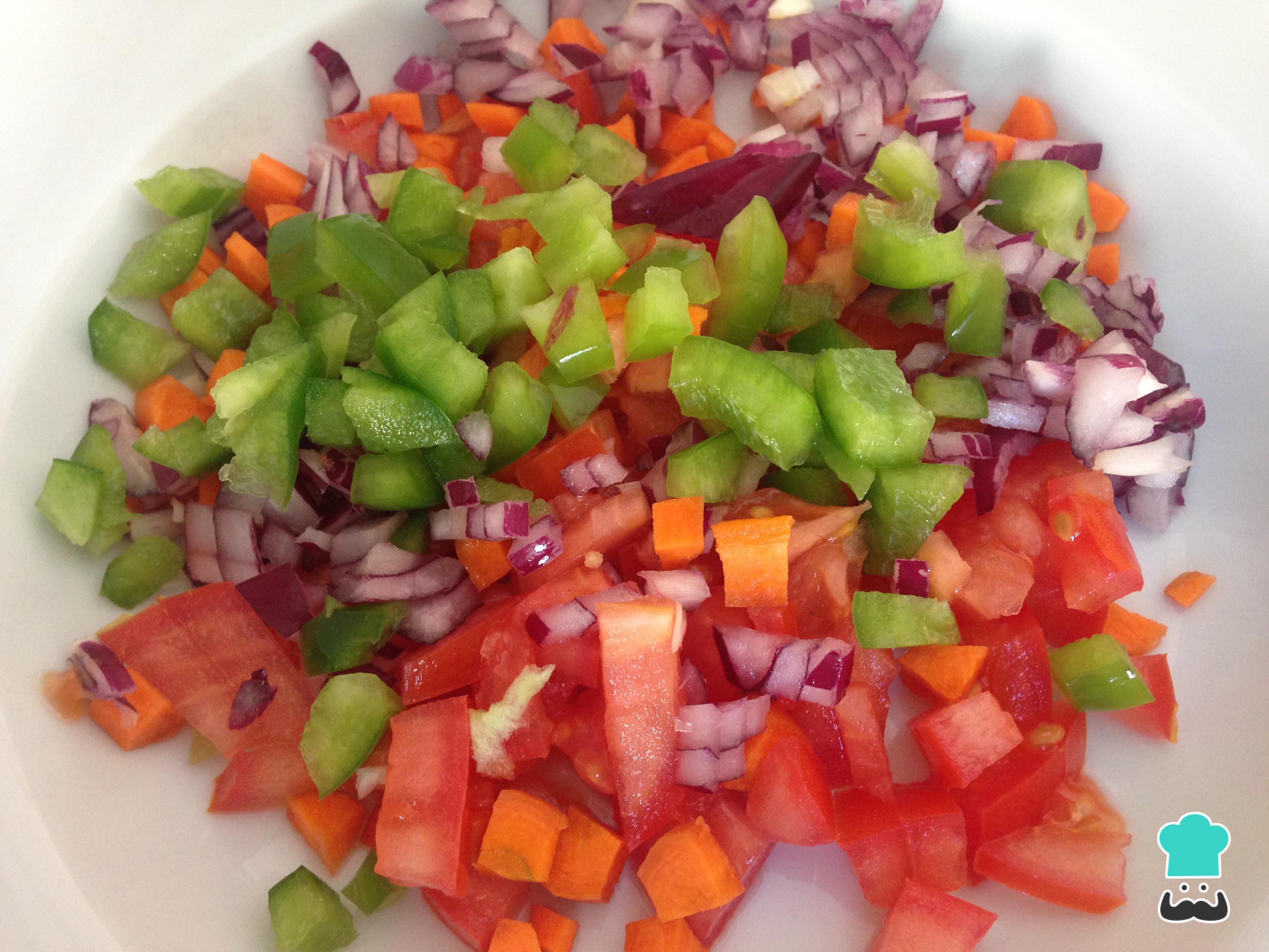 Picamos la cebolla y el pimiento también en cuadraditos finos. Agregamos al tomate y la zanahoria.