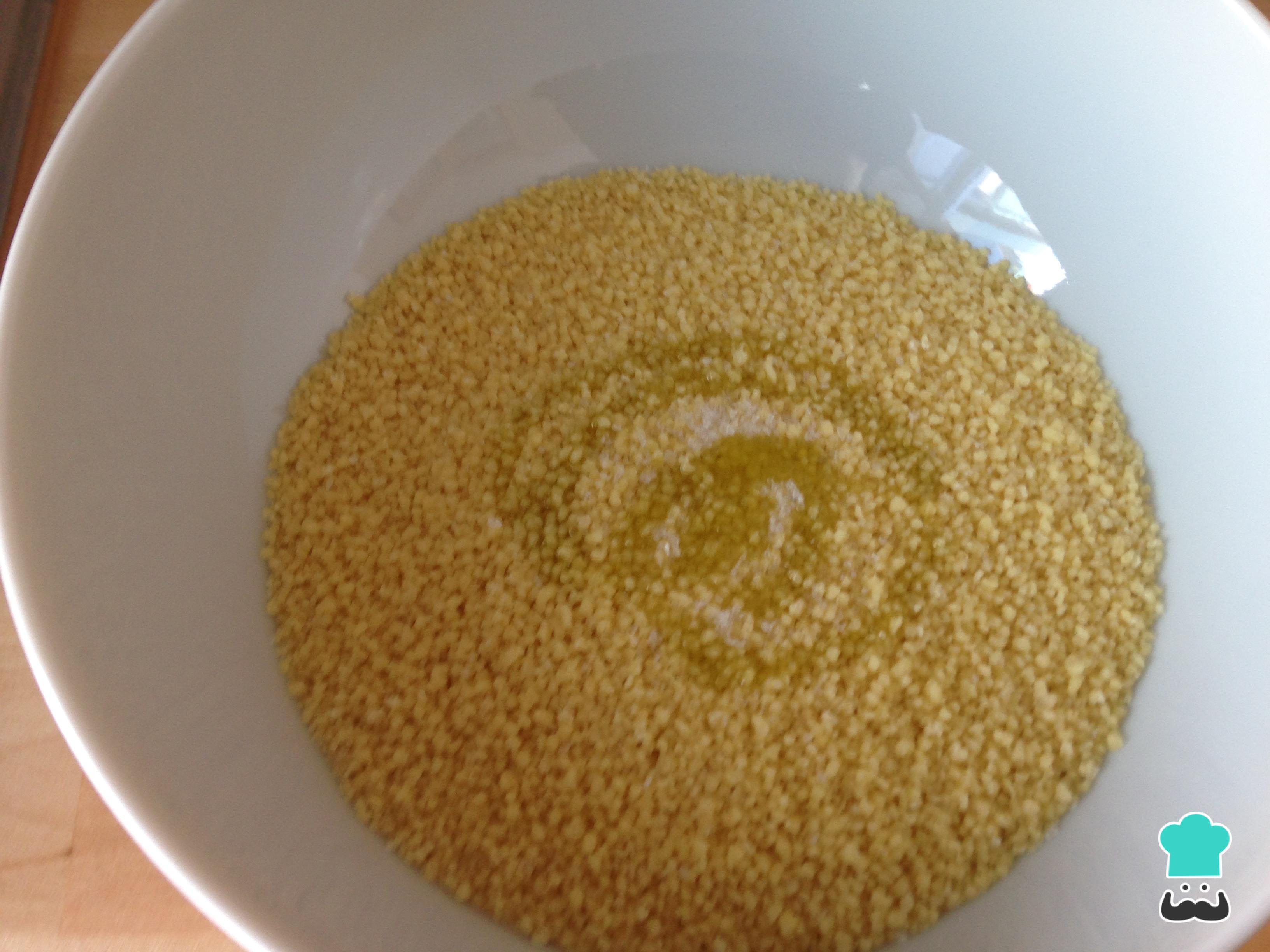 Para hacer el cuscús, ponemos la sémola en un bol con una pizca de sal y un poco de aceite de oliva. Trabajamos el cuscús con las manos, impregnando los granos con el aceite de oliva. Mientras, ponemos la misma cantidad de agua a cocer hasta que hierva. Una vez que hierva, agregamos el agua al cuscús y dejamos reposar durante 2 minutos. Pasado este tiempo, movemos el cuscús con la ayuda de un tenedor, para separar los granos. Dejamos reposar hasta que enfríe.