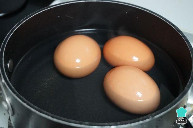 Para hacer la ensalada de garbanzos veraniega rápida primero pon a cocer huevos duros. Añade los huevos en un cazo con agua y, cuando empiece a hervir el agua, ponlos en la cazuela y déjalos 10 minutos. Retira y deja enfriar.
