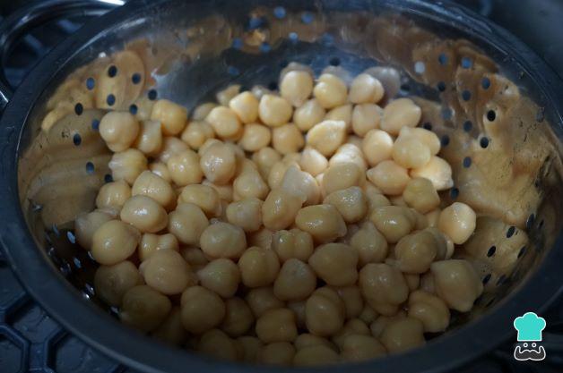 Lava los garbanzos cocidos y escúrrelos bien. A continuación, añade los garbanzos en una fuente de servir. Por otro lado, si lo deseas, puedes cocer los garbanzos añadiendo toda la noche en agua. A continuación, añade en una olla a cocer en agua con una cebolla y una hoja de laurel, tardarán un par de horas. Pero si tienes olla rápida en 20-30 minutos los tendrás cocidos.