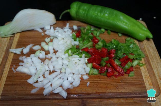 Prepara las verduras. Lávalas y corta la cebolla en tiras o en trozos pequeños, limpia el pimiento verde y el pimiento rojo de las pepitas, también córtalo en trozos pequeños.