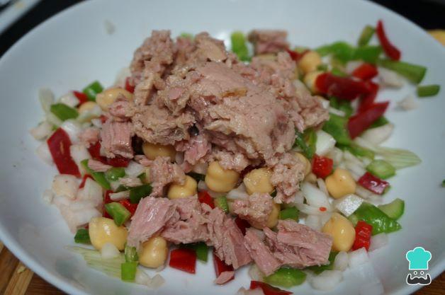 Abre las latas de atún en aceite, escúrrelas y desmiga un poco, añádelas a la ensalada de garbanzos de bote.