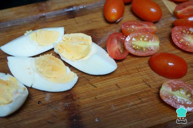 Corta los tomates cherry por la mitad y añade junto con los garbanzos. A continuación, pela los huevos y córtalos en cuartos o en trozos pequeños.
