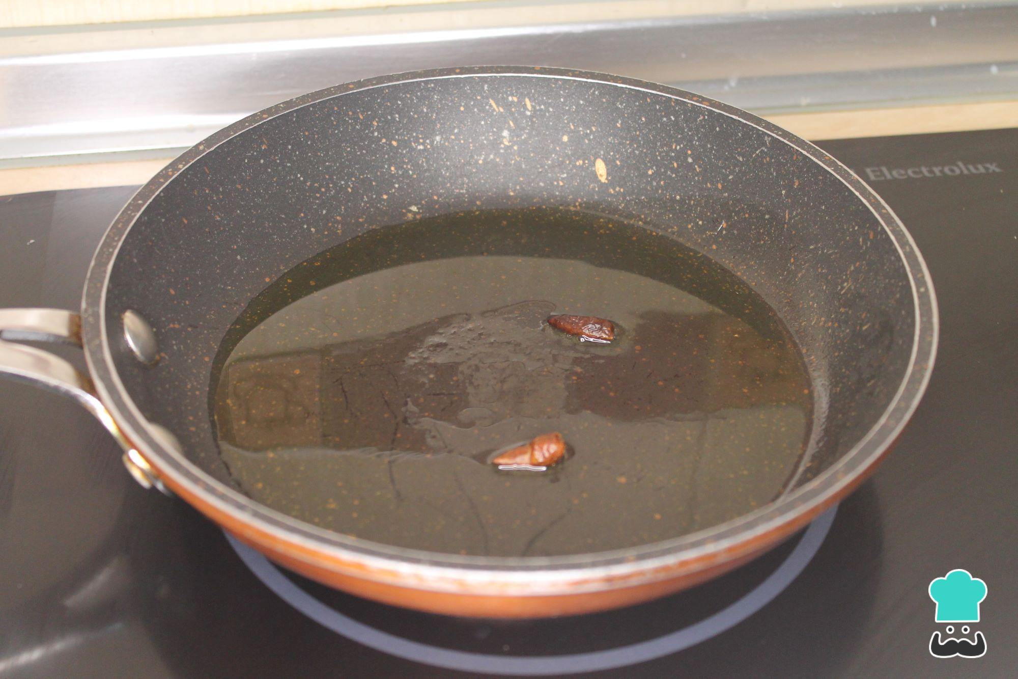 Pon en una sartén al fuego un chorrito de aceite de oliva y, cuando esté caliente, añade dos pimientas de cayena secas y deja que se doren a fuego no muy fuerte para aromatizar el aceite de oliva.