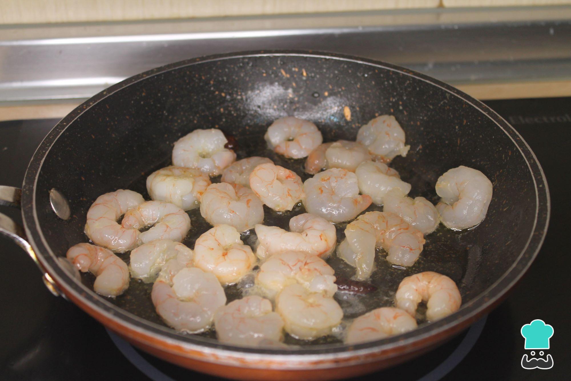 Cuando las guindillas se hayan dorado, añade las gambas peladas con un poco de sal y ve removiendo de vez en cuando hasta que queden cocinadas, tardará unos 5 minutos dependiendo de su tamaño.