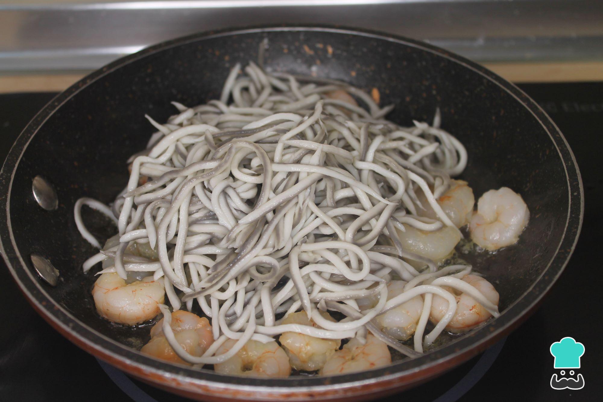 Cuando estén cocinadas las gambas, añade las gulas y remueve durante 2 minutos.