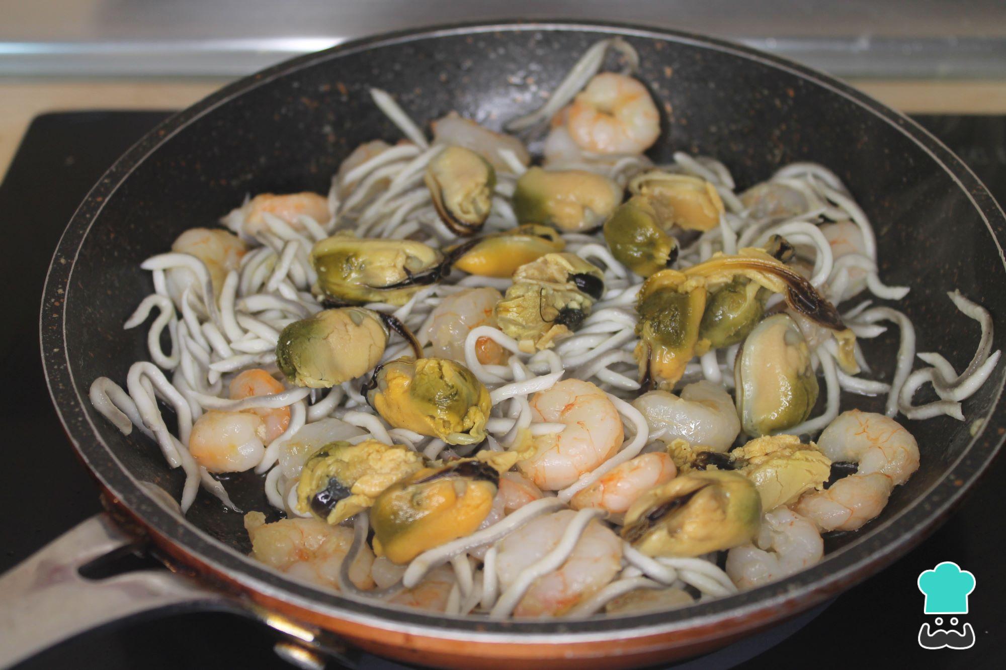 Escurre la lata de mejillones al natural e incorpora en la sartén junto con las gambas y las gulas, removiendo unas pocas vueltas. Retira del fuego.