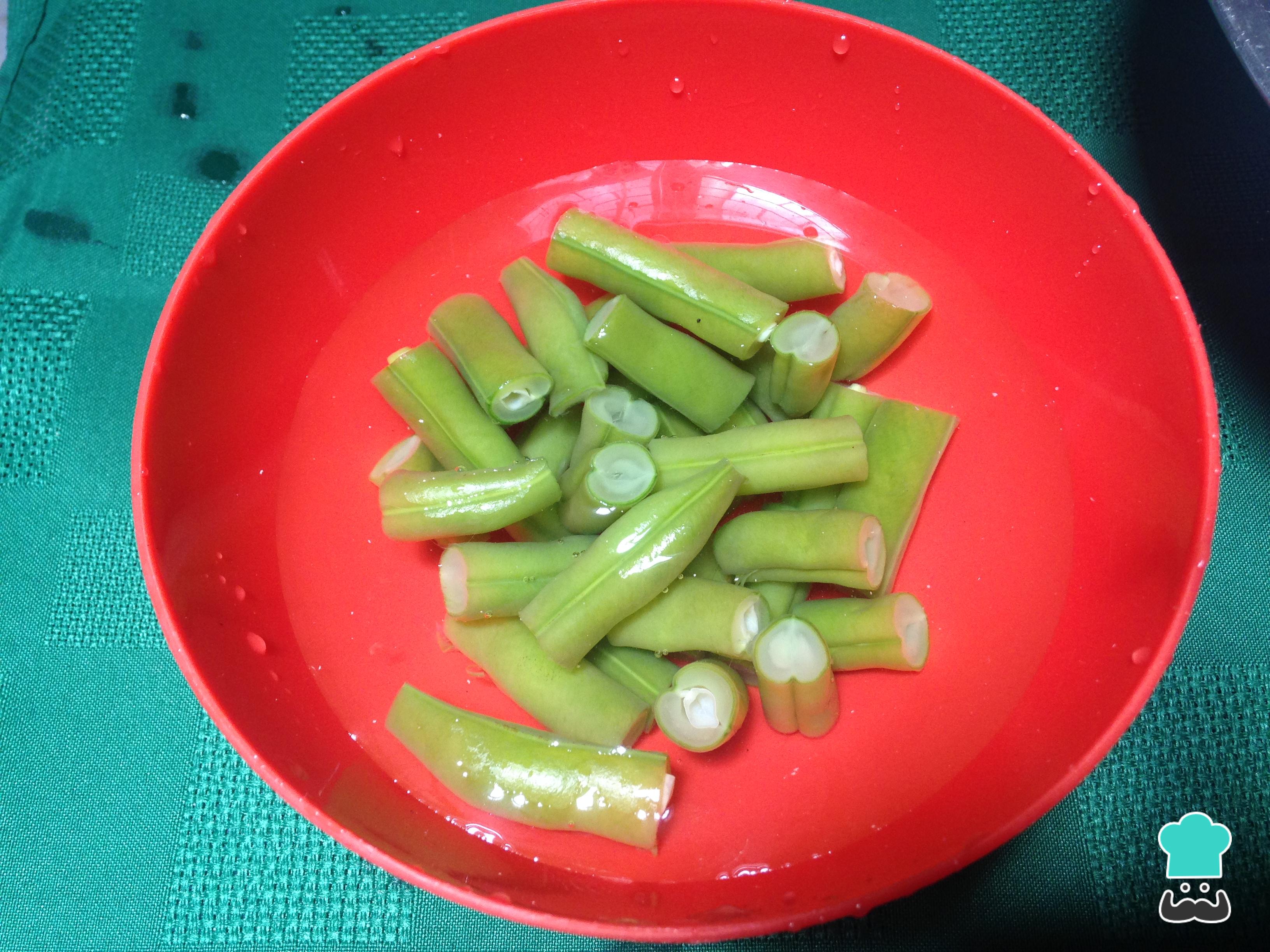 Lavar y cocinar las patatas desde agua fría y sin pelar con un poco de sal, pasada media hora agregamos las judías y las cocinamos durante 10 minutos.