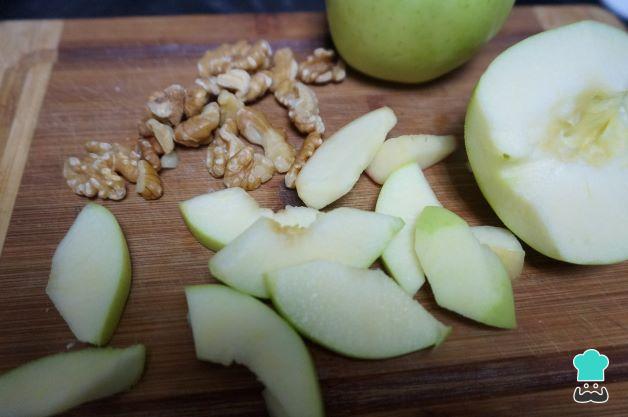 Pela las nueces, lava las manzanas y corta en rodajas, en cuadrados o en tiras, como te guste. Si lo deseas, puedes dejar la piel de la manzana. La cantidad será la que uno quiera. A continuación, corta el limón e incorpora un poco de zumo por la manzana para que no se oxide, es opcional.