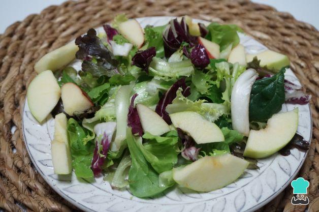 La ensalada de manzana y queso consiste en una elaboración muy fresca para empezar una comida o acompañar cualquier plato. Además, contiene nueces y esto la hace más completa. Por otro lado, debes saber que se pueden preparar ensaladas de muchas maneras y con una variedad de ingredientes, ya que se pueden hacer muchas combinaciones. Son ideales como entrantes o para acompañar. En esta ocasión, lleva manzana que es excelente para combinar con nueces, queso, también puedes añadir pasas, semillas, pipas, etc.