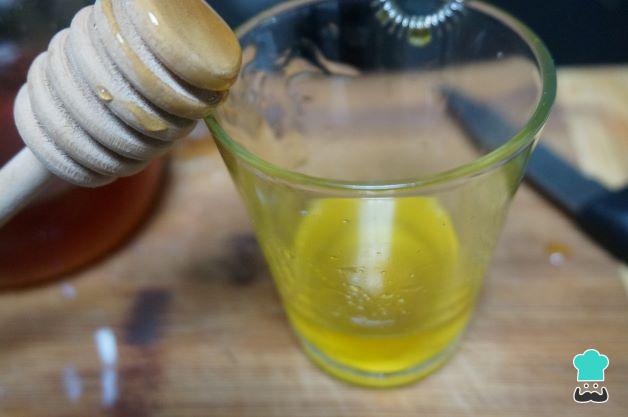 En una jarra o un vaso añade el aceite de oliva, un poquito de sal y una cucharada de miel, bate hasta emulsionar la mezcla. Puedes poner un poco de pimienta, añadir vinagre o poner más miel. Una vez que la pruebes puede rectificarla al gusto.