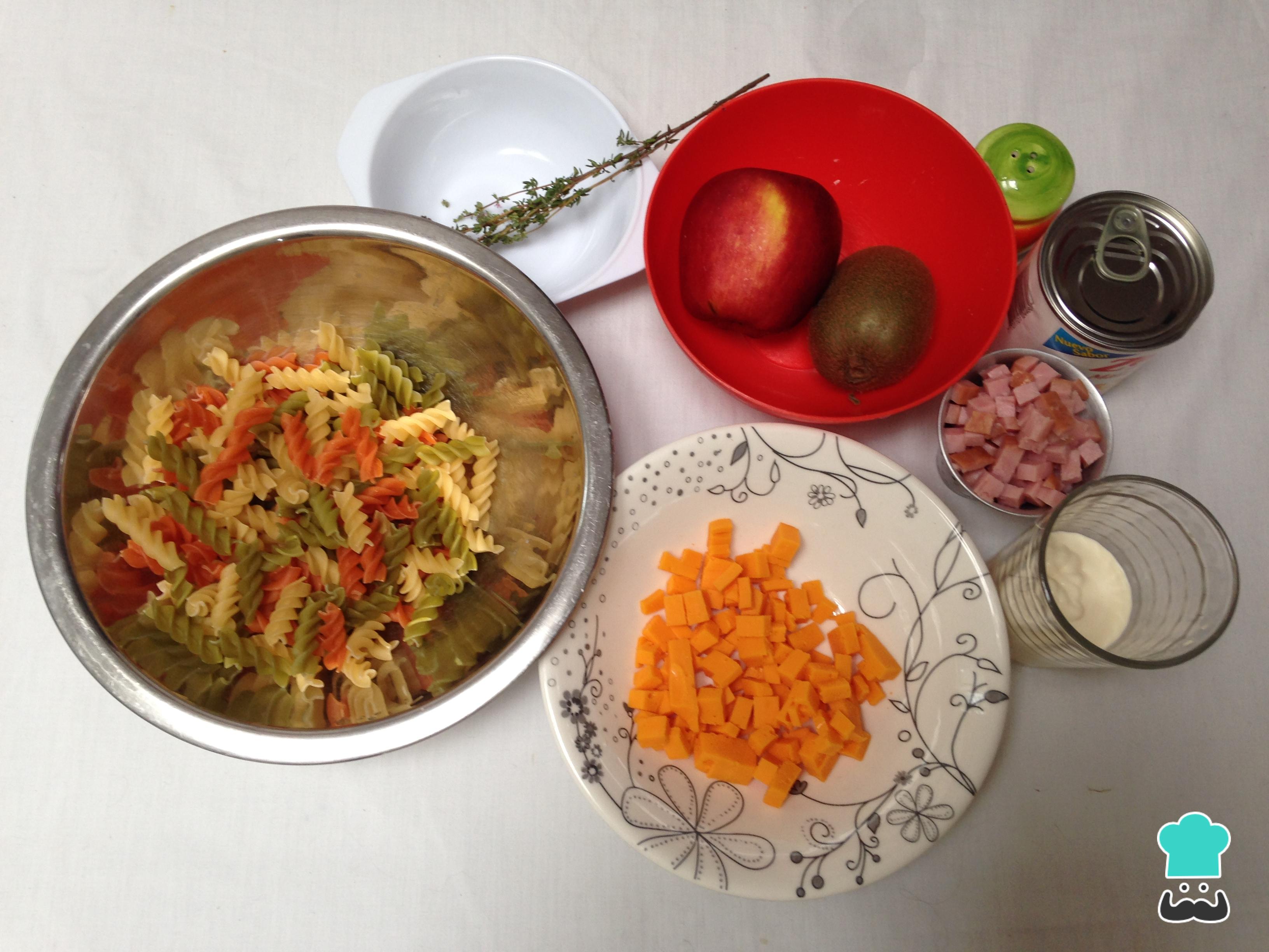 Para esta receta de ensalada de pasta con fruta debemos primero alistar los ingredientes.