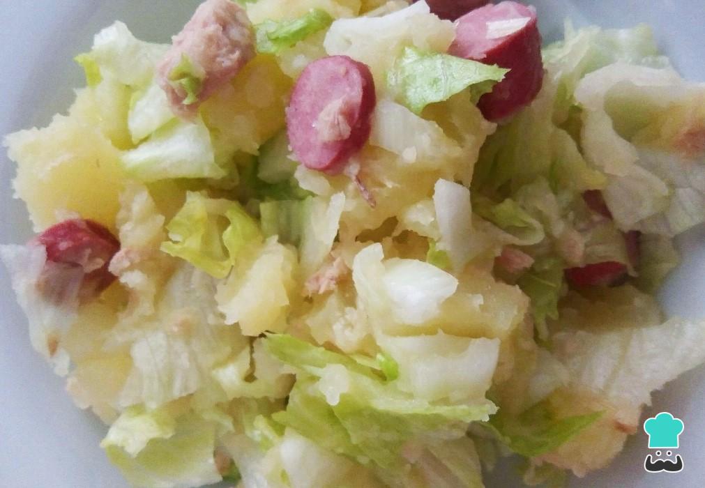 Esta ensalada de papas cocida con lechuga la puedes servir fría o templada. Para hacerla templada, simplemente tendrás que escurrir el agua cuando las papas y las salchichas estén listas y mezclar allí mismo con la cebolla y la lechuga.