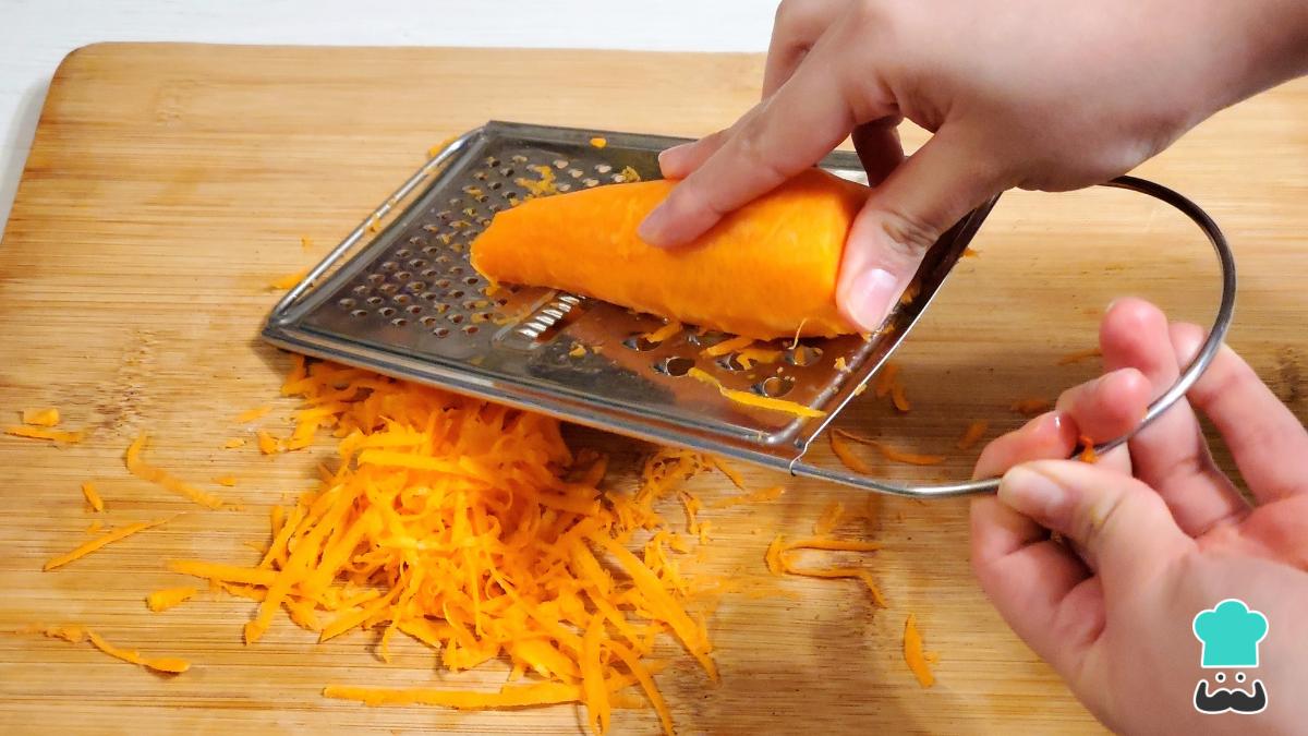 Por otro lado, pela la zanahoria y rállala procurando obtener tiras largas. Así se integrarán mejor con las tiras de repollo, creando una textura uniforme. Una vez lista, mézclala directamente con el repollo en el mismo bowl.