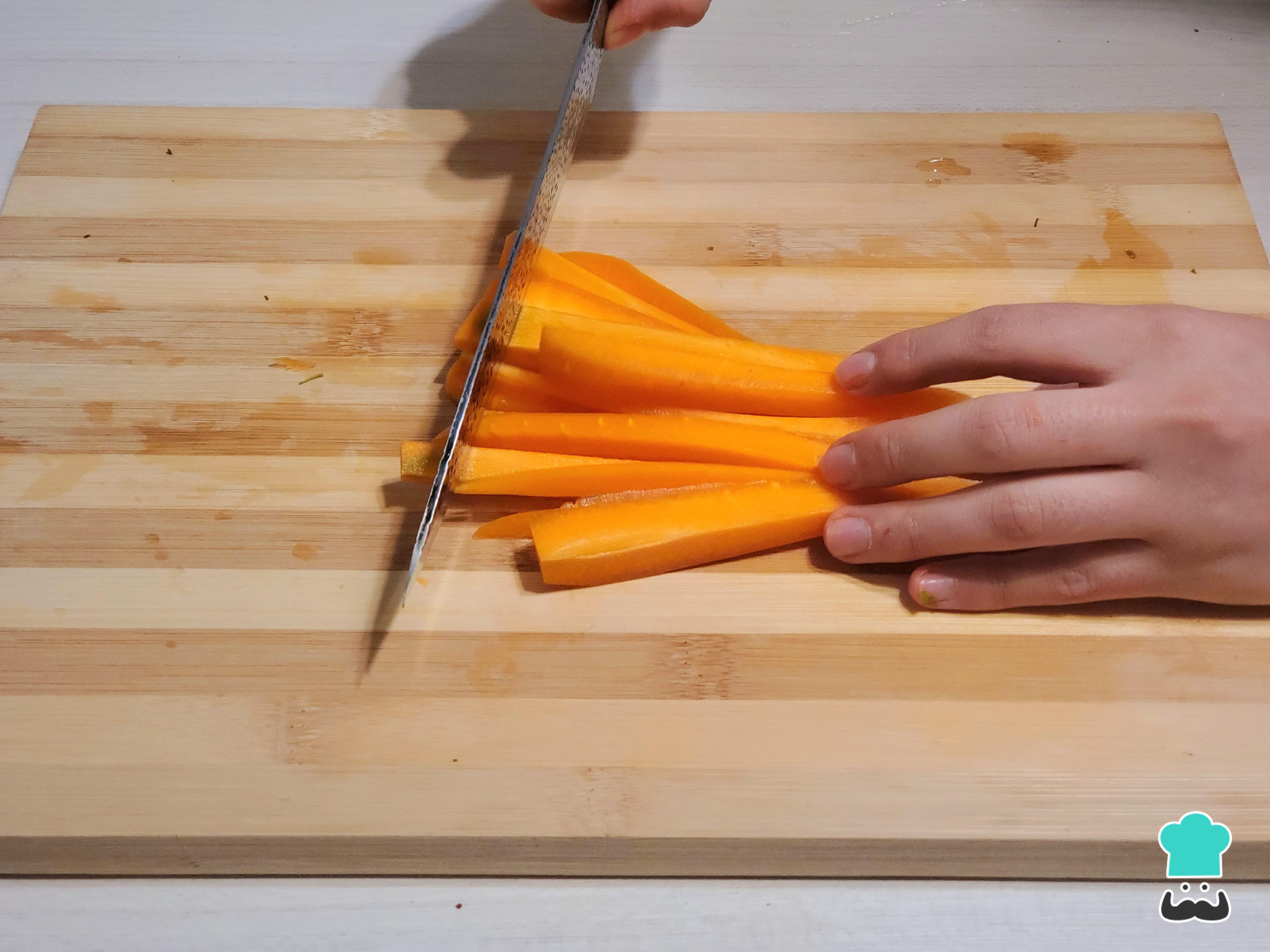Para preparar esta ensalada comienza cortando los vegetales. En una tabla coloca las zanahorias peladas y córtalas en láminas gruesas de aproximadamente medio centímetro de grosor. Apílalas y córtalas en bastones del mismo grosor; finalmente, colócalos de forma transversal y corta en dados medianos.