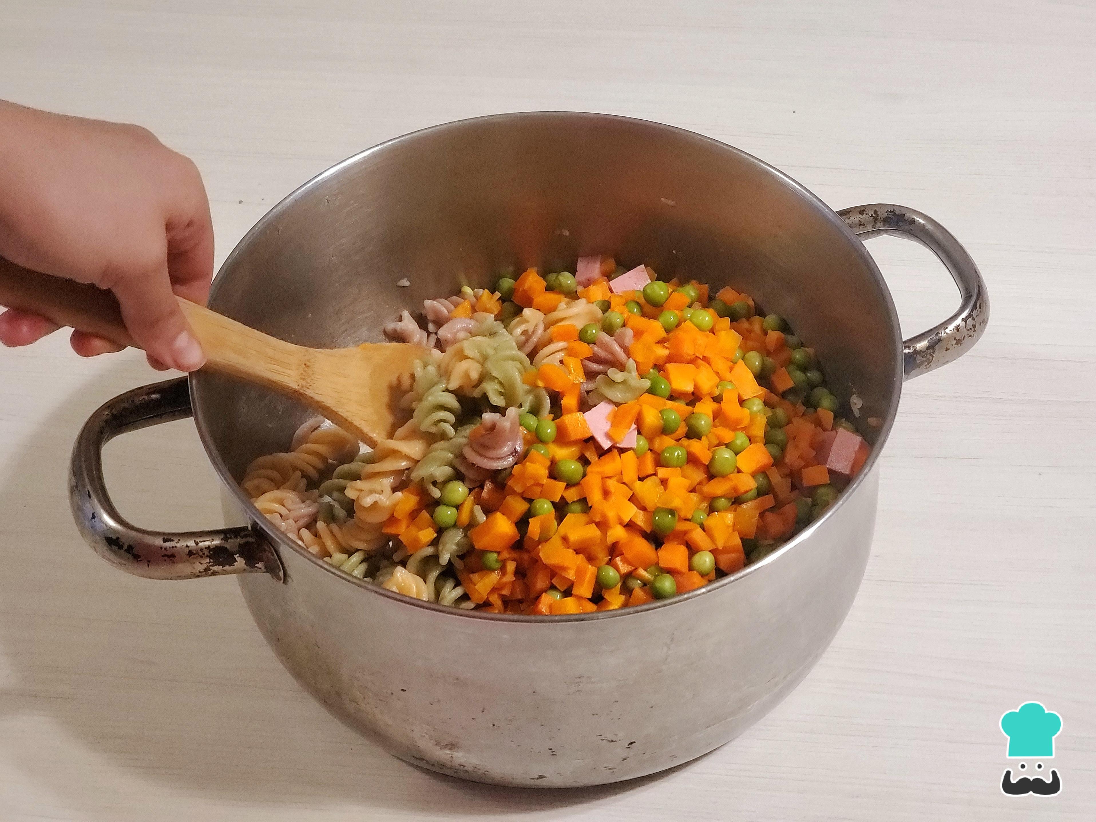 En otra olla con abundante agua caliente, sancocha la pasta. La más utilizada para esta ensalada es la pasta en forma de tornillos y de colores, ya que la hace más vistosa y festiva. Cocínala por unos 10 minutos, o según las recomendaciones del empaque, asegurándote de retirarla cuando esté al dente.