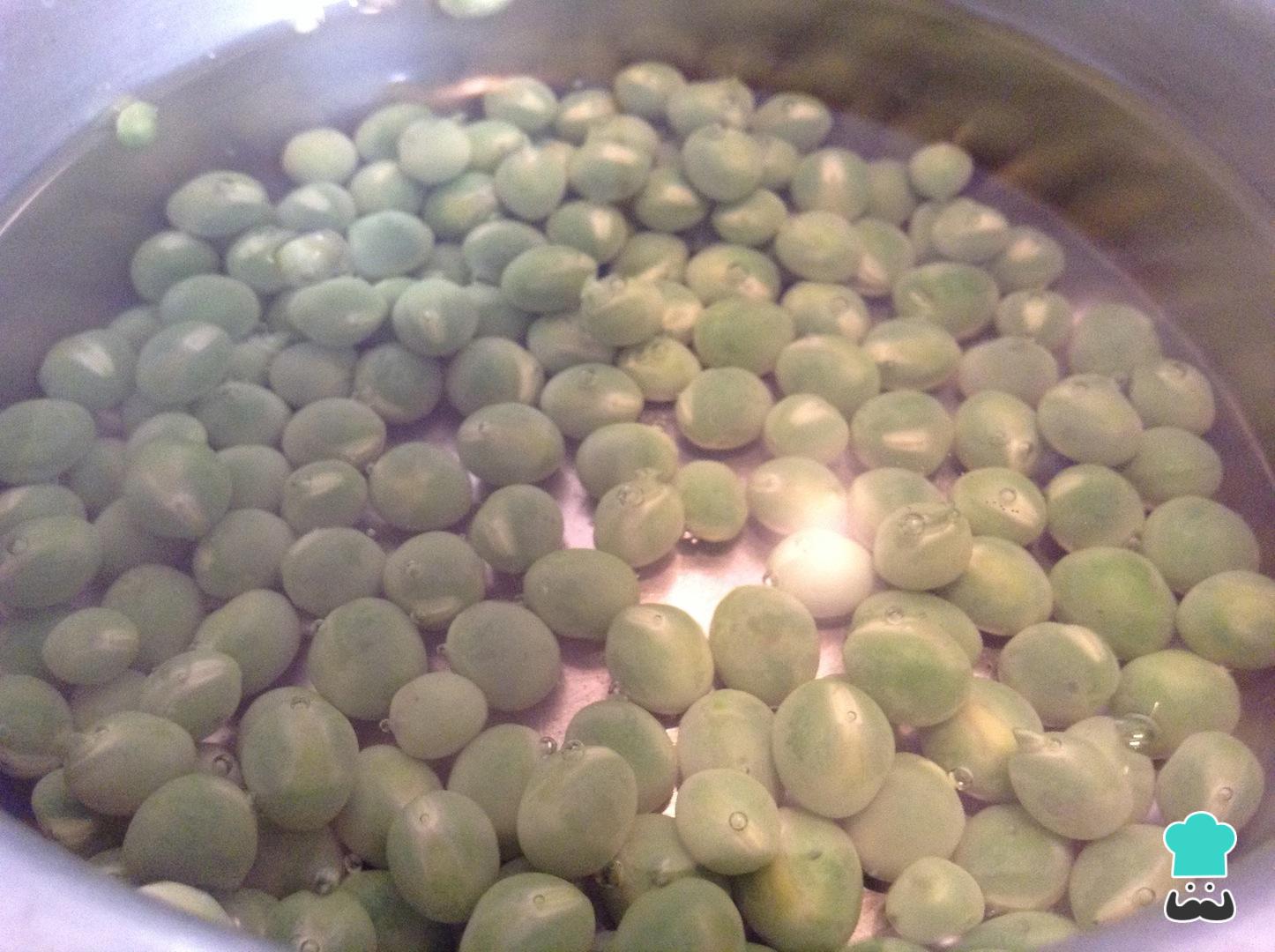 Lleva una olla con agua a fuego medio y, una vez hierva el agua, adiciona los guisantes o arvejas con un poco de sal. Deja cocinar hasta que estén blandos.