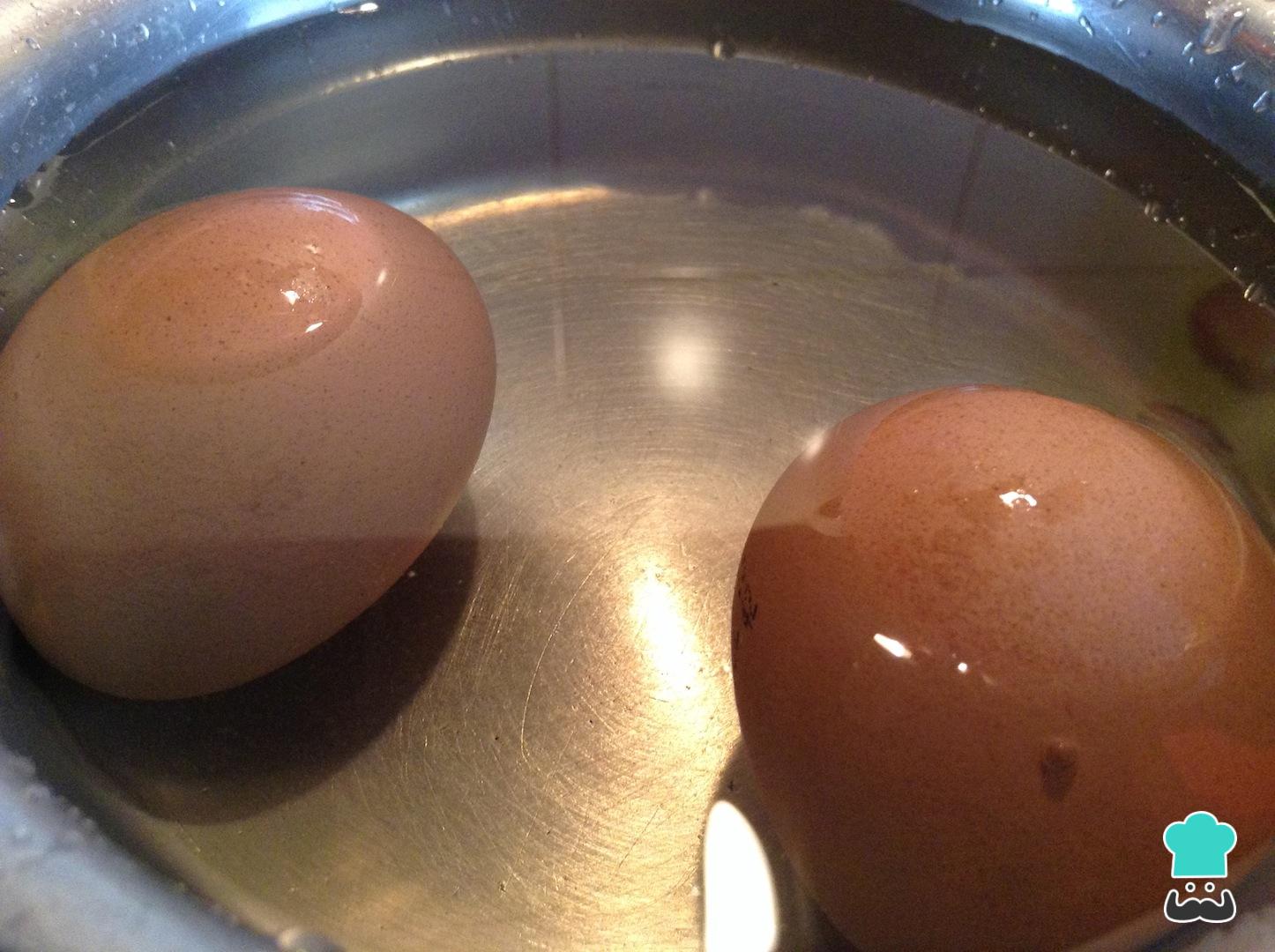 Incorpora los huevos en una olla con suficiente agua para que los cubra y cocínalos hasta que estos estén duros. Reservar.
