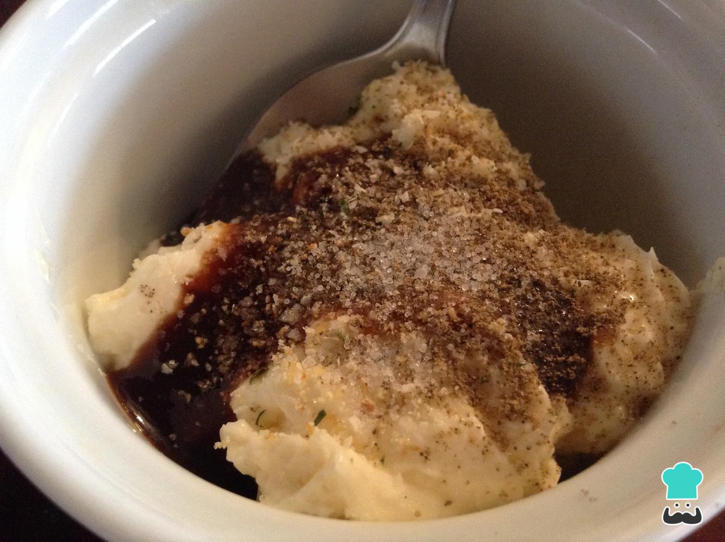En un bol aparte, debemos añadir los ingredientes del aderezo para la ensalada. Es decir, mezclamos bien la salsa Worcestershire, la mayonesa, el ajo en polvo, la sal y la pimienta negra al gusto.