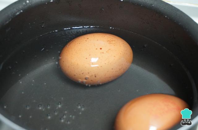 Por otro lado, calienta otro cazo con agua a fuego alto. Cuando empiece a hervir, cuece los huevos a fuego medio. Cuando el agua hierva de nuevo, cuenta 10 minutos de cocción, retíralos, deja que se enfríen y pélalos.