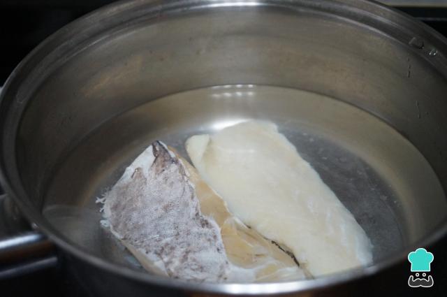 Introduce el bacalao desalado en un cazo con un poco de agua caliente y cuécelo unos minutos. Cuando esté, sácalo y reserva.