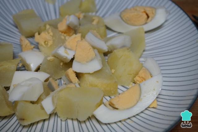 Corta las patatas en trozos pequeños, pica los huevos y mezcla ambos ingredientes en una ensaladera o la fuente que vayas a utilizar para servir la ensaladilla malagueña de bacalao.
