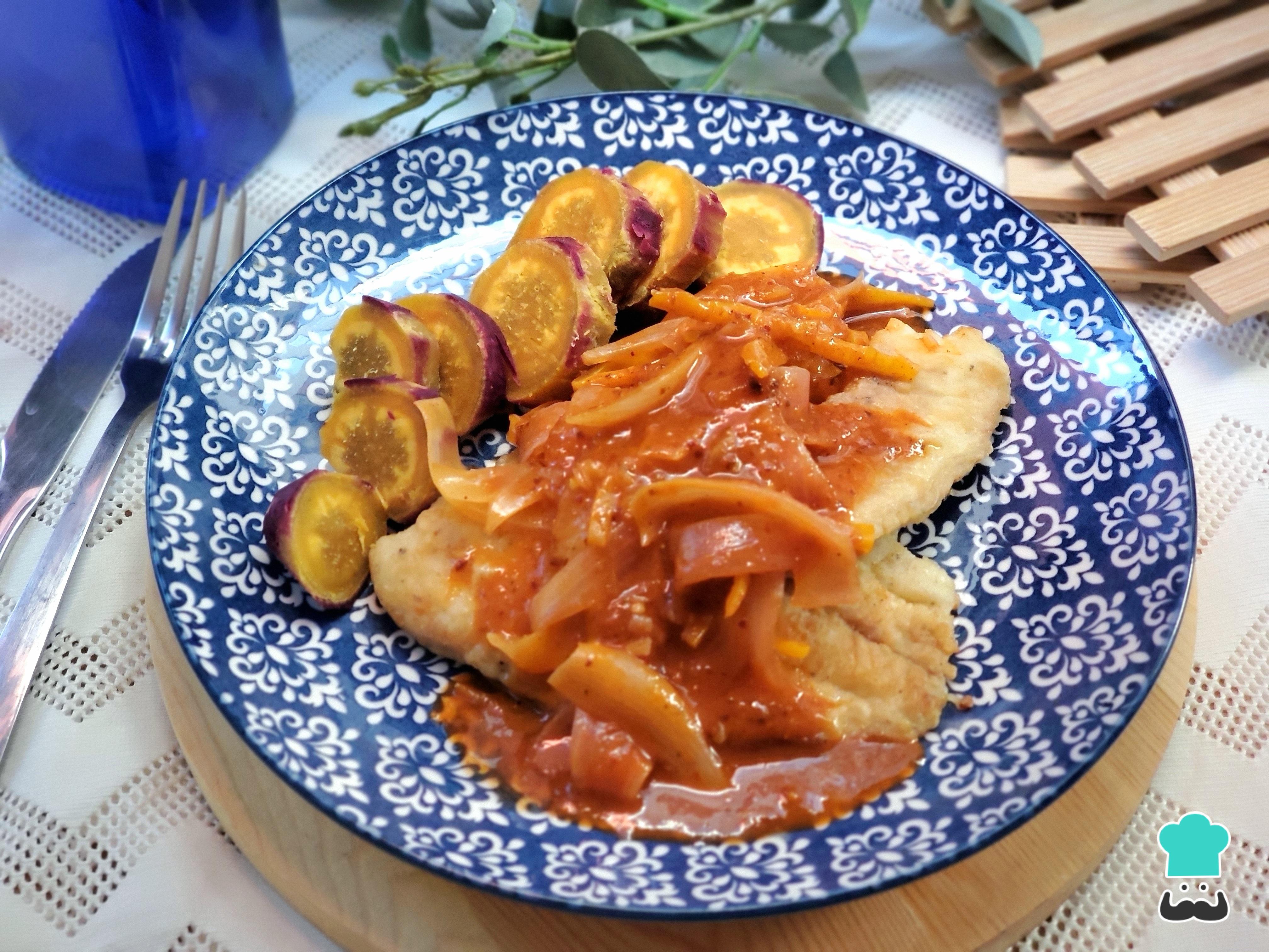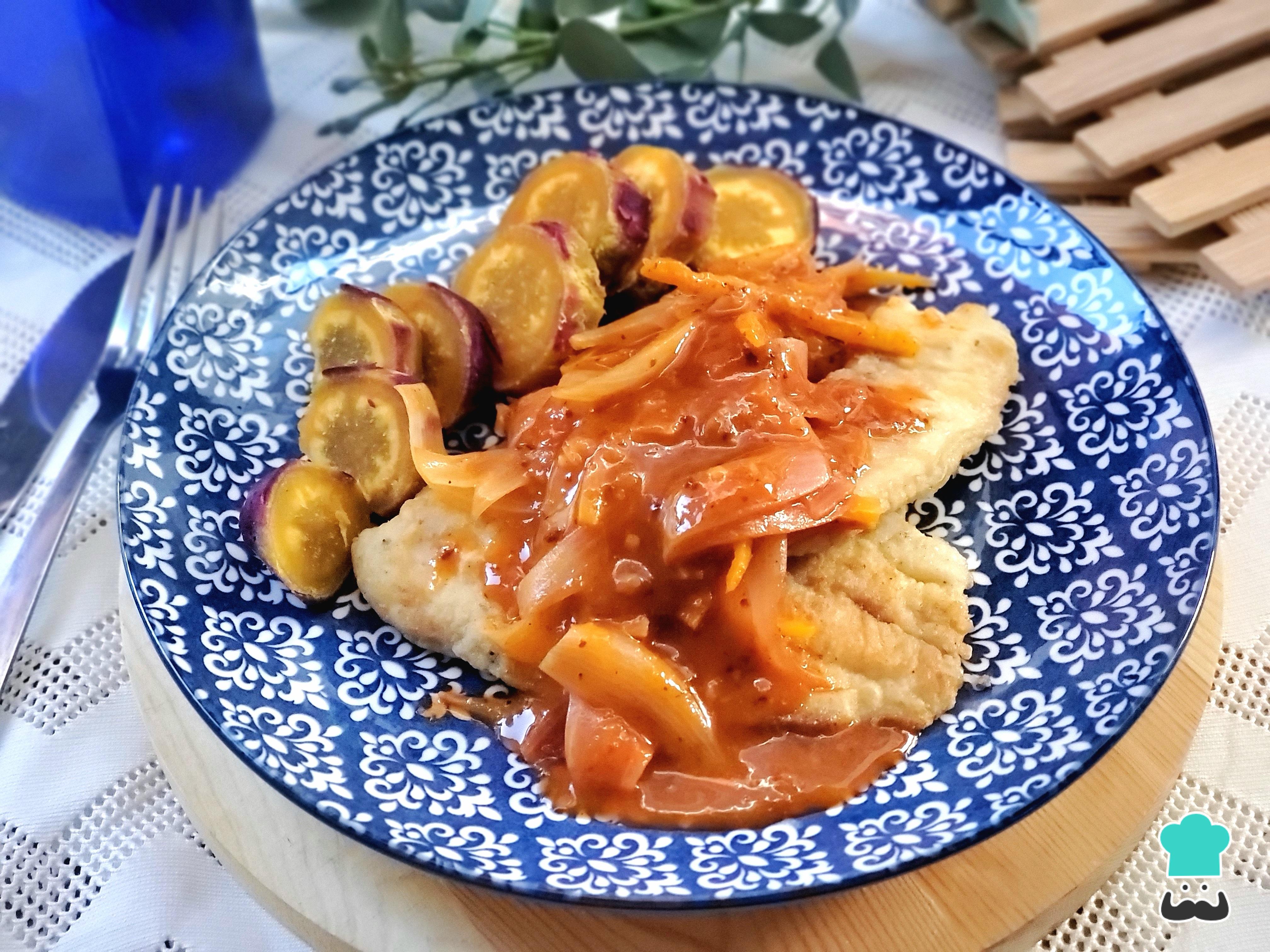 Sirve inmediatamente el filete al lado unas rodajas de camote sancochado y unas hojas de lechuga. Encima vierte la salsa de escabeche con las cebollas y ajíes. Si deseas, decora con un huevo duro en mitades y aceitunas negras. ¡Buen provecho! Cuéntanos en los comentarios tu opinión y comparte con nosotros una fotografía del resultado final.