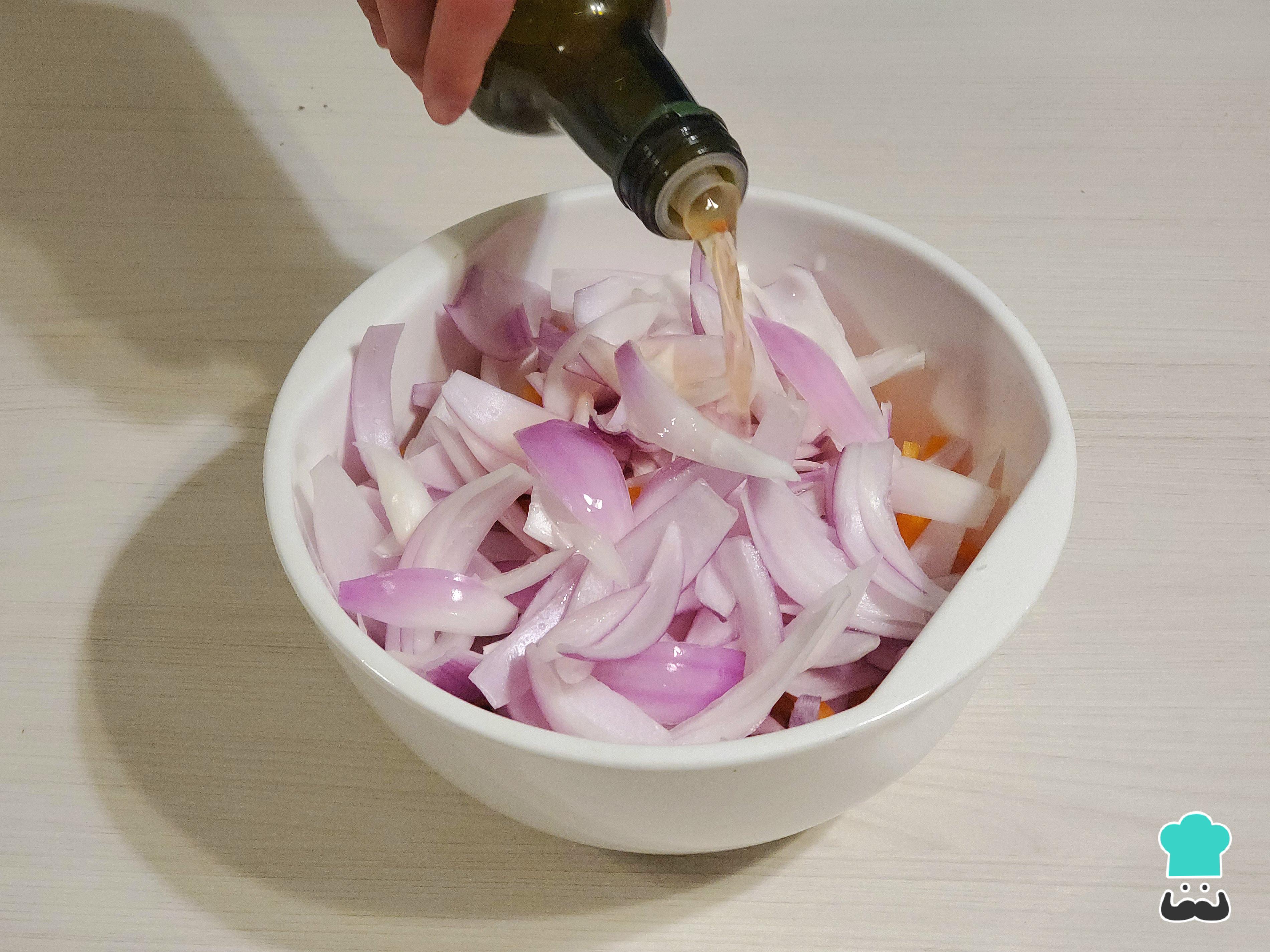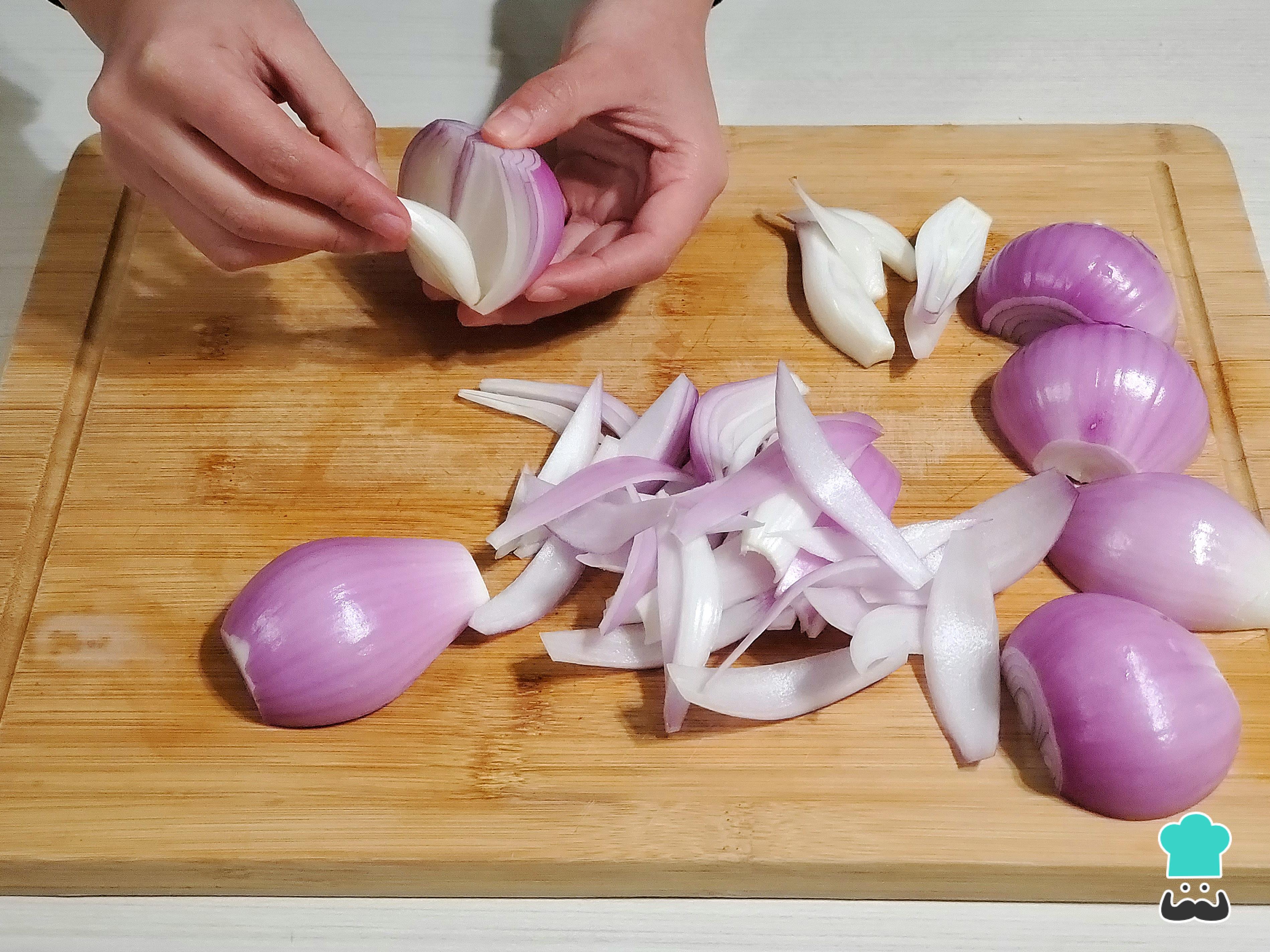 Empieza cortando las cebollas en gajos o en pluma. Para hacerlo, primero corta los extremos de las cebollas, luego pártelas por la mitad y retira la capa más externa; también retira el corazón, pícalo en dados pequeños y resérvalo para preparar el aderezo. Por último, corta las cebollas en tiras gruesas o gajos como para lomo saltado.