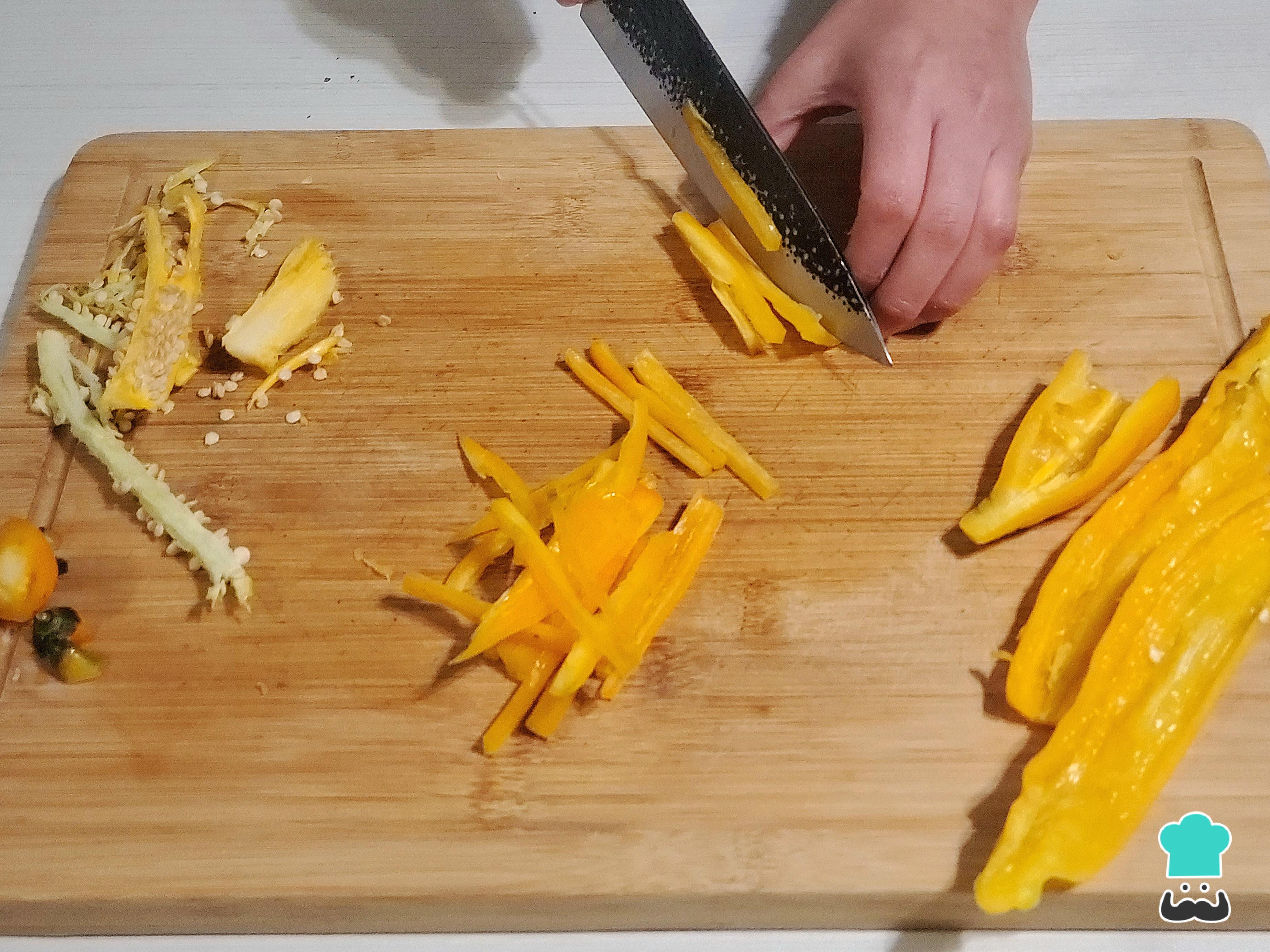 Corta los ajíes amarillo en juliana, es decir, corta los extremos de los ajíes y pártelos por la mitad. Con una cuchara, retira las semillas y las venas. Luego, procede a cortarlos por la mitad y pica en tiras finas. Si no te gusta que la salsa sea muy picante, puedes lavarlos bien.