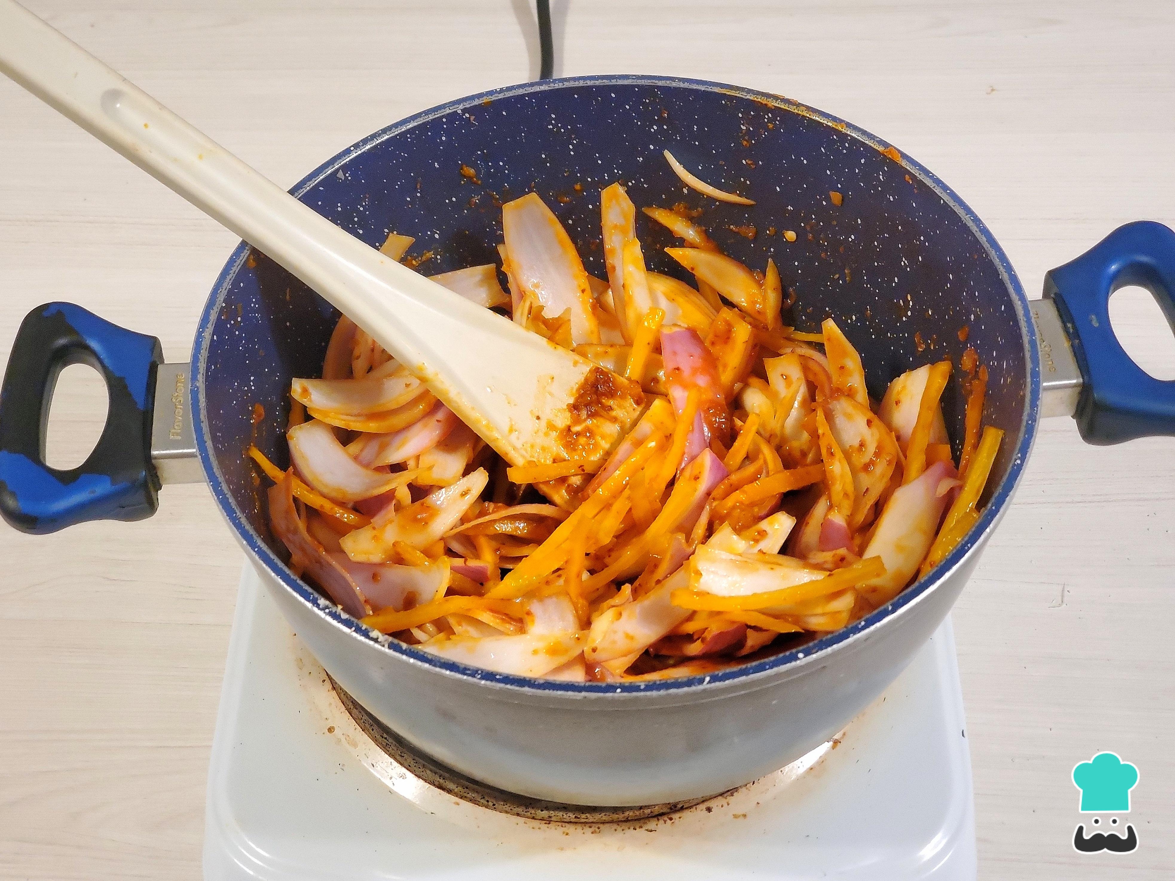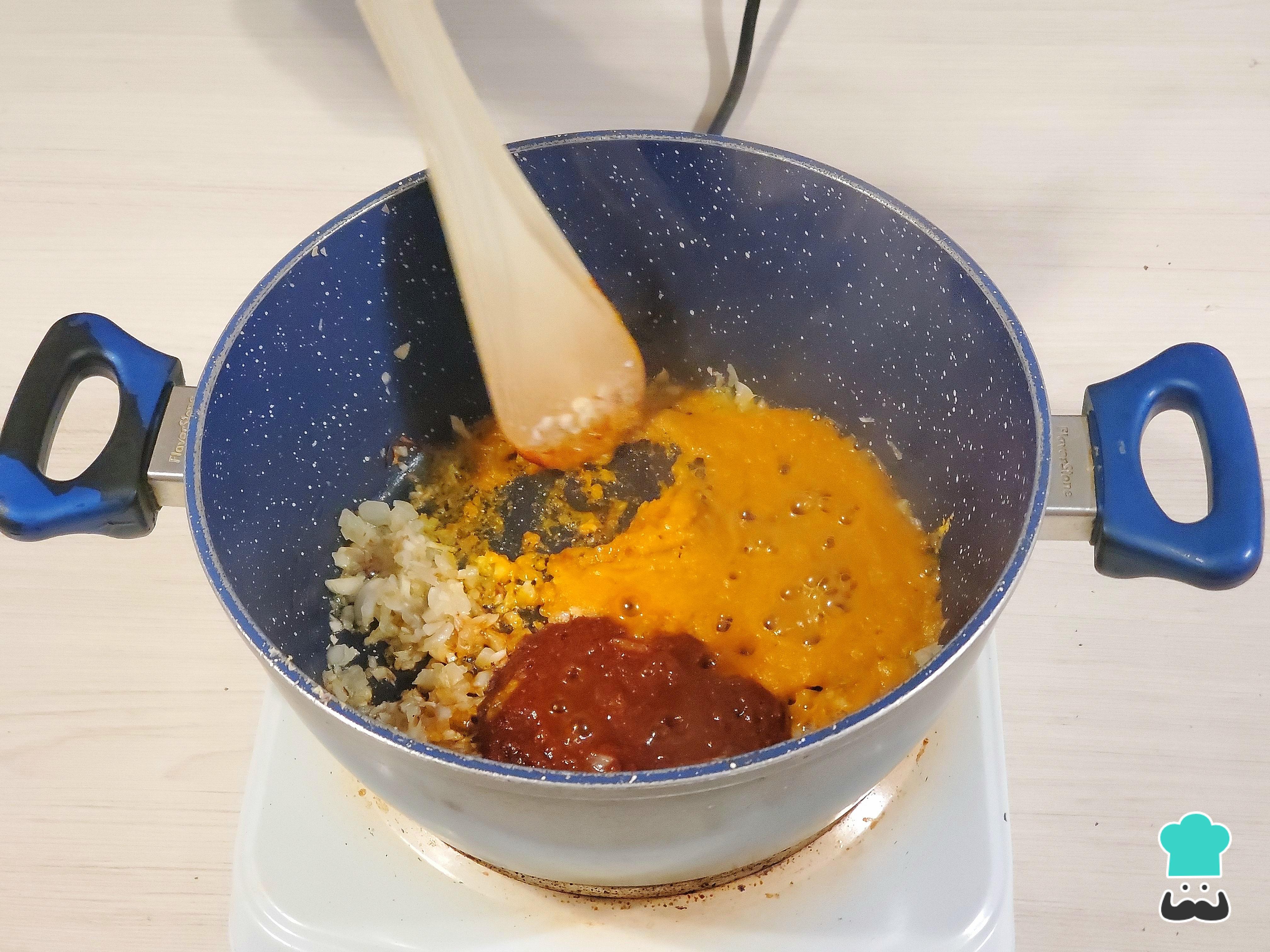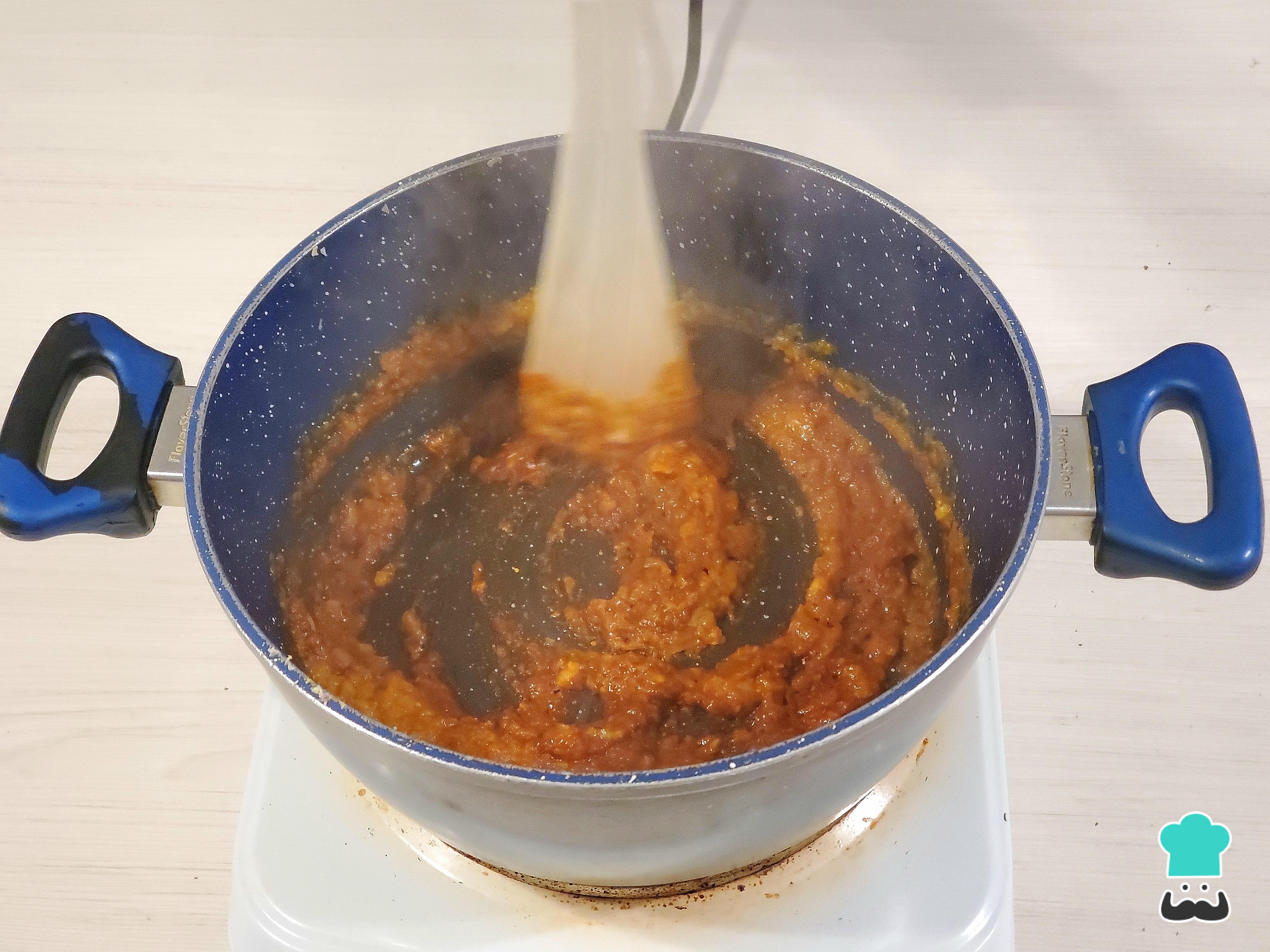 Remueve por unos 20 minutos más esporádicamentemanteniendo a fuego bajo para evitar que se queme. Este aderezo estará listo cuando obtenga la textura de una mermelada y el aceite se esté separando. También aromatiza unas hojas de laurel, orégano seco molido, pimienta negra molida, comino molido y una pizca de sal.