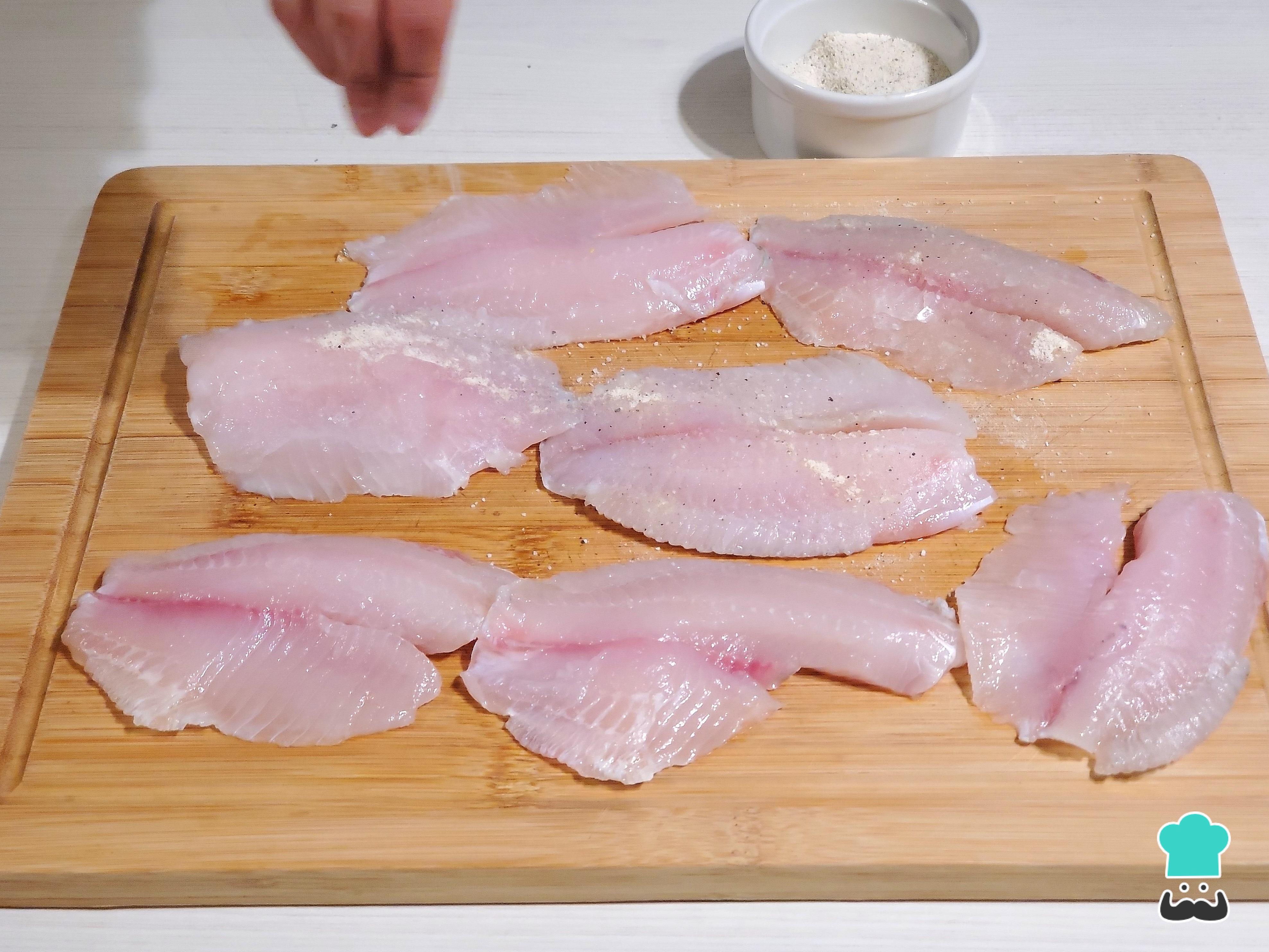 Aparte, condimenta el pescado. En un pequeño recipiente mezcla sal, pimienta y ajo en polvo. Remueve bien y espolvorea los filetes con esta mezcla por ambos lados. Si no tienes ajo en polvo, utiliza ajo molido y masajéalos bien. Refrigera los filetes por 30 minutos para que se impregnen de sabor.