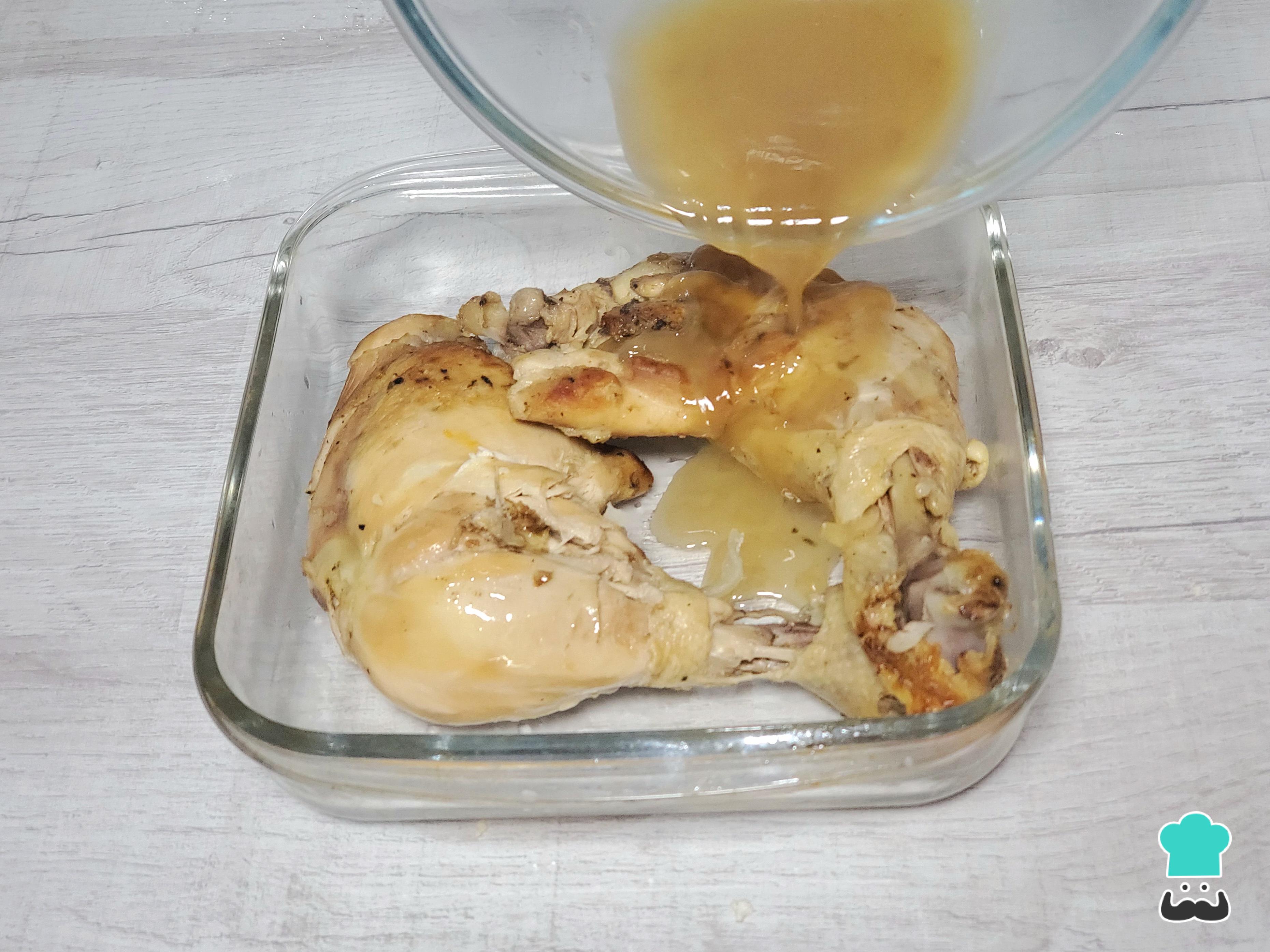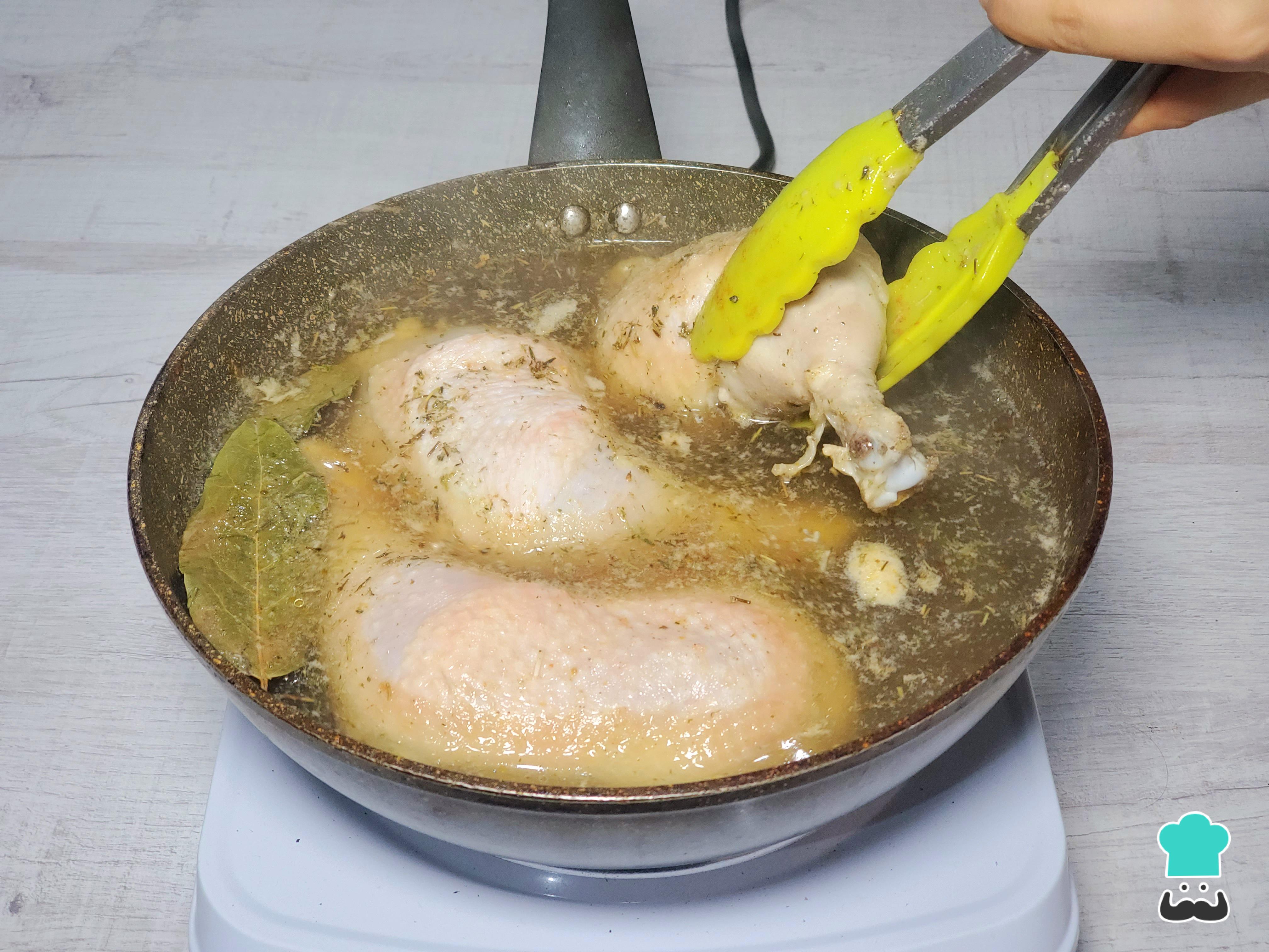 Empieza limpiando las piezas de pollo; si tienen mucha grasa, córtala. Para cocinarlas, hierve abundante agua en una olla y sazona con dientes de ajo, hojas de laurel, orégano y sal. Sumérgelas y deja que se sancochen durante unos 25 minutos, o hasta que estén bien cocidas. Retira y reserva.