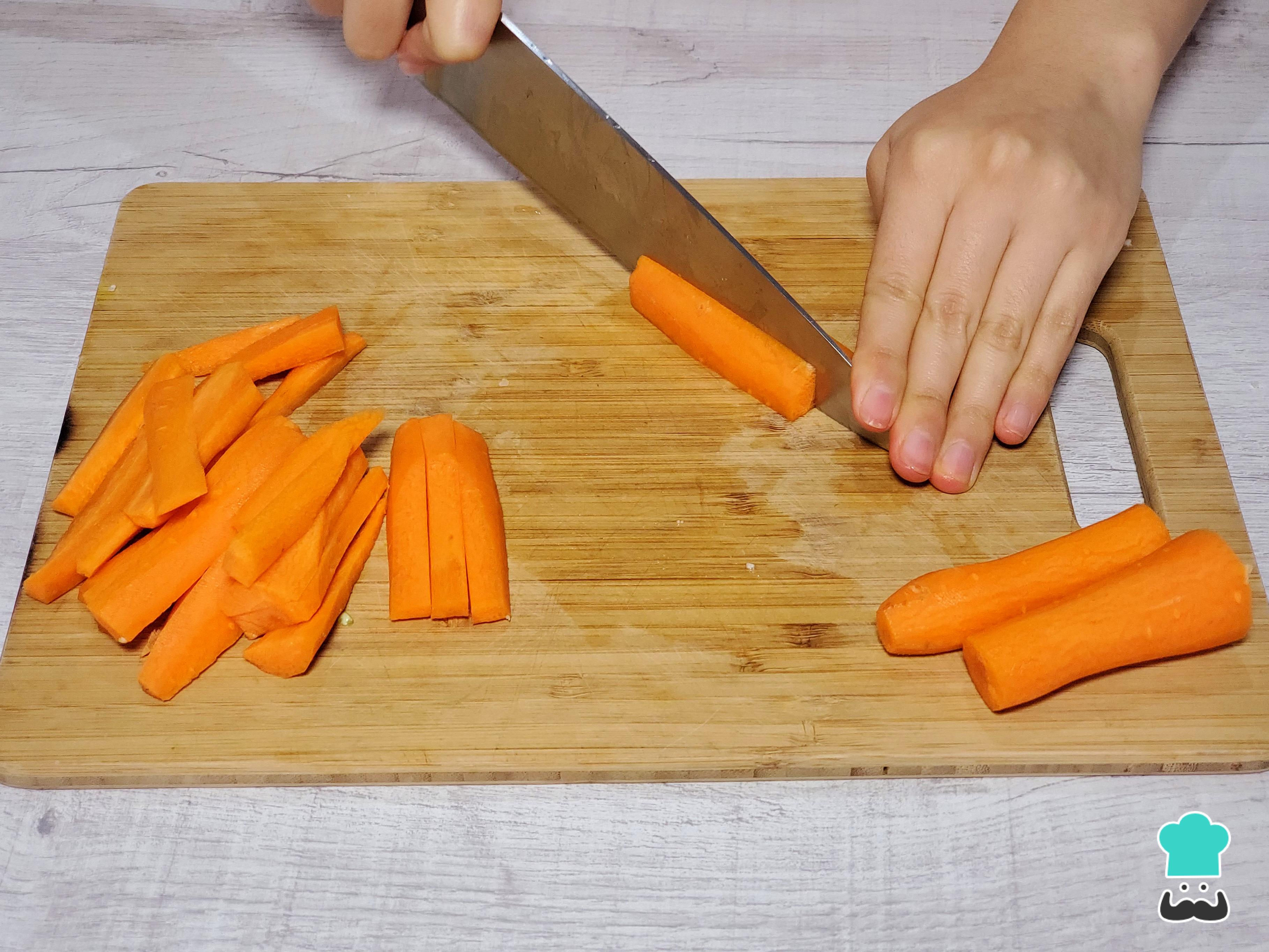 Corta los vegetales. Las zanahorias, una vez peladas, puedes cortarlas en rodajas gruesas y, luego, de forma transversal para obtener bastones; si son delgadas, también puedes cortarlas de manera sesgada.