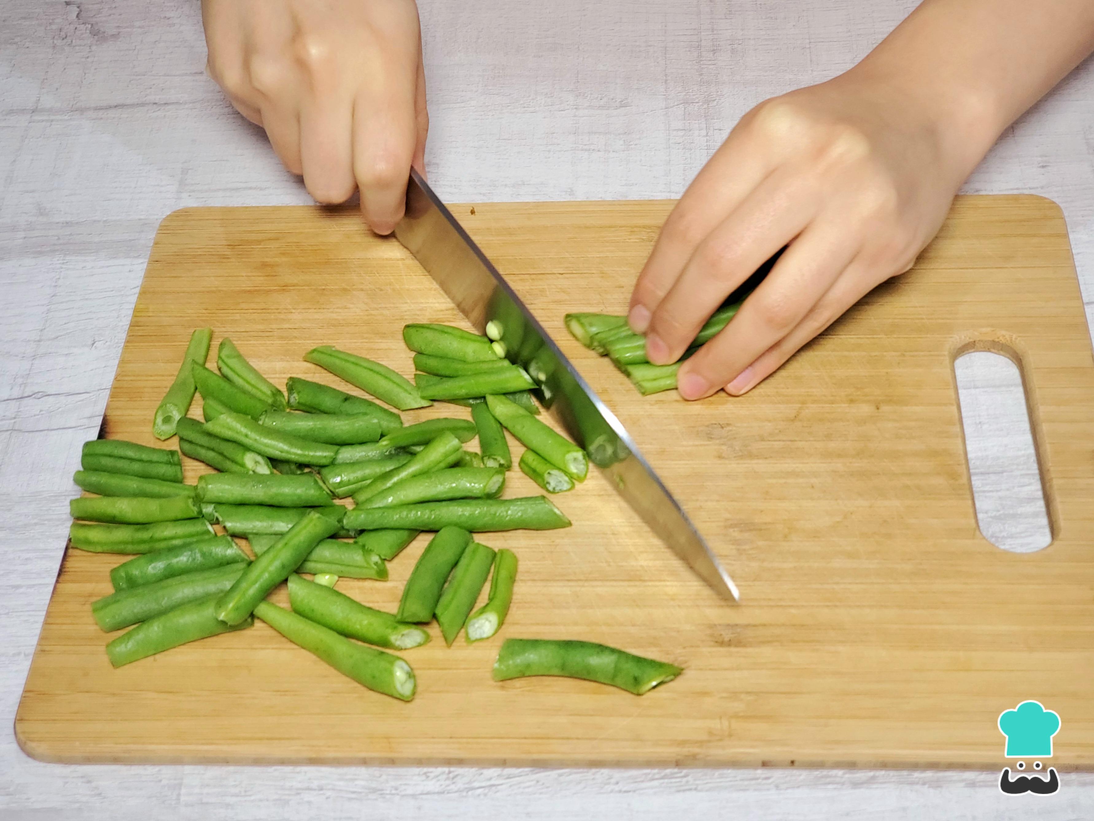Corta las vainitas en segmentos del tamaño de las zanahorias, y si gustas, también de forma sesgada.