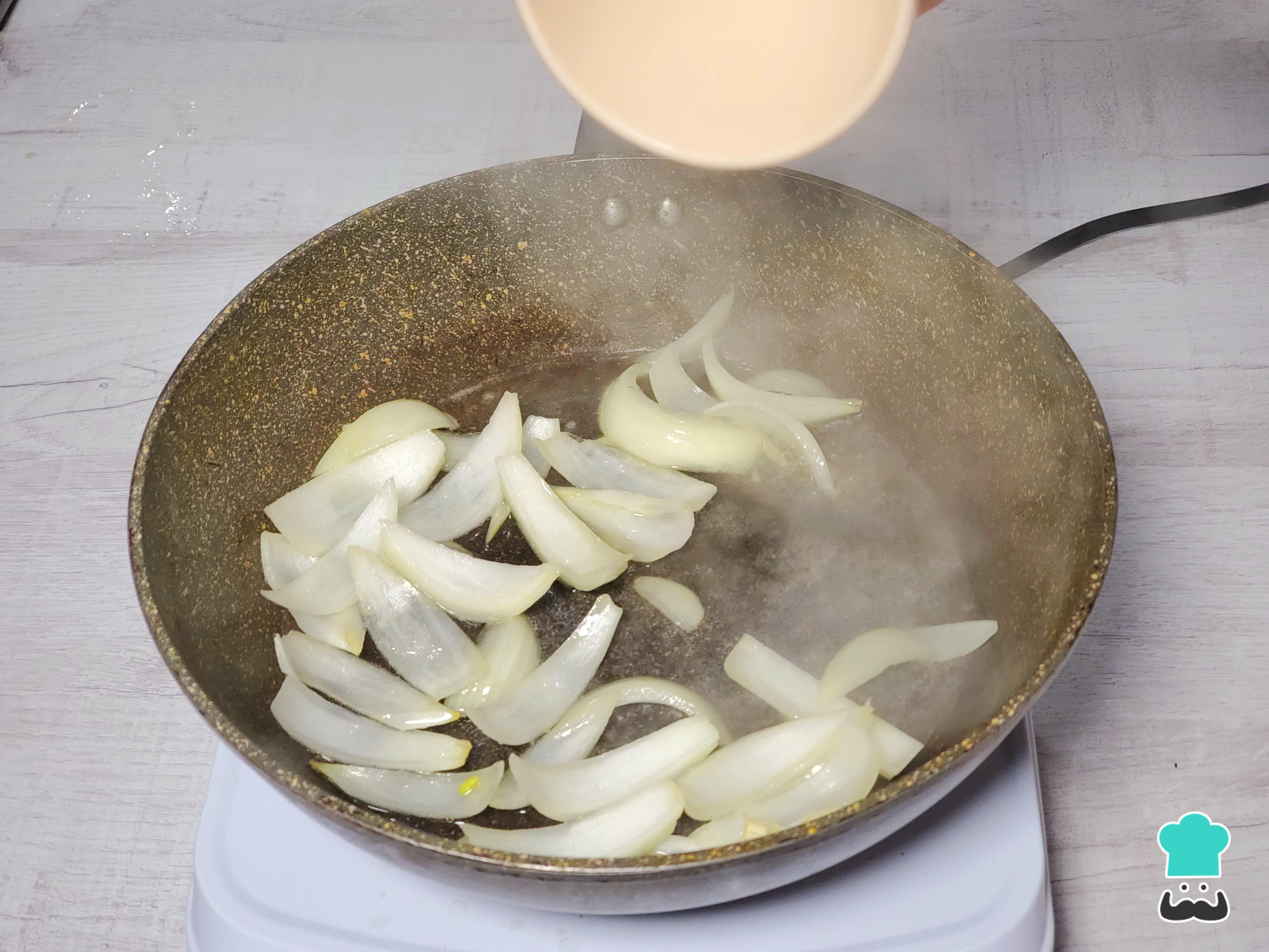 Corta la cebolla en gajos, retirando los extremos y la capa exterior. Dórala en una sartén con un poco de aceite, y añade un cucharón del caldo de pollo para suavizar su sabor sin perder el crocante. Si prefieres, puedes incorporar también tomates cortados en gajos.