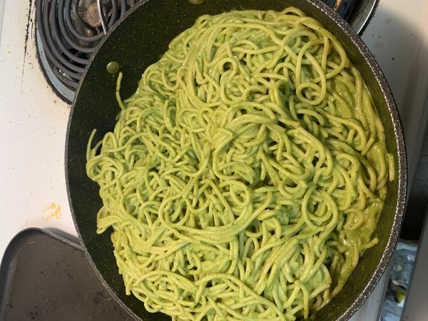 De esta forma conseguiremos ese color tan especial de los espaguetis verdes con chile poblano, aunque si quieres acentuarlo, también puedes añadir un poco de espinacas.