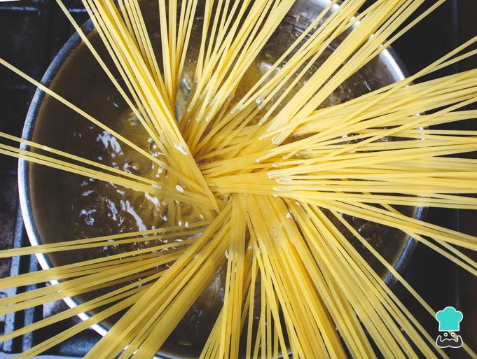 Lo primero que debes hacer para empezar a preparar la receta de pasta verde es hervir los espaguetis. Para ello, coge una olla con la capacidad suficiente, ponla a calentar con agua y agrega especias al gusto para aromatizar la pasta. Vierte, también, un chorrito de aceite y dos cucharadas medianas de consomé pollo en polvo.
