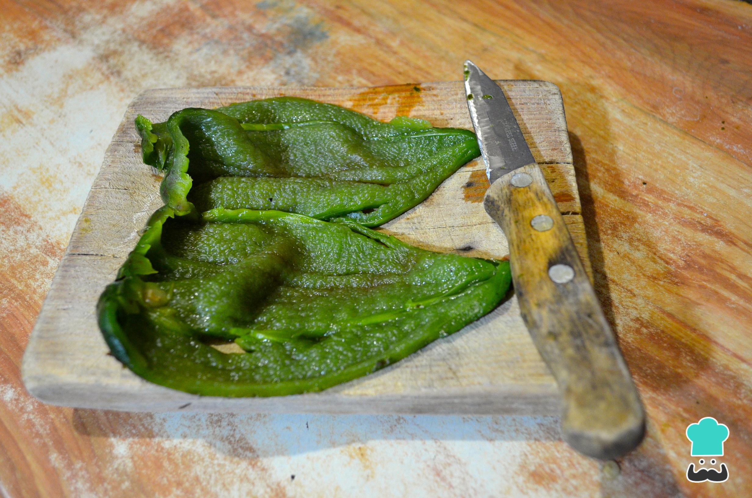 Una vez asados, introduce los chiles poblano en una bolsa de plástico y ciérrala para que suden y puedas retirar la piel más fácilmente. Déjalos dentro durante 5 minutos, luego quita la piel, las semillas y las venas de los chiles.