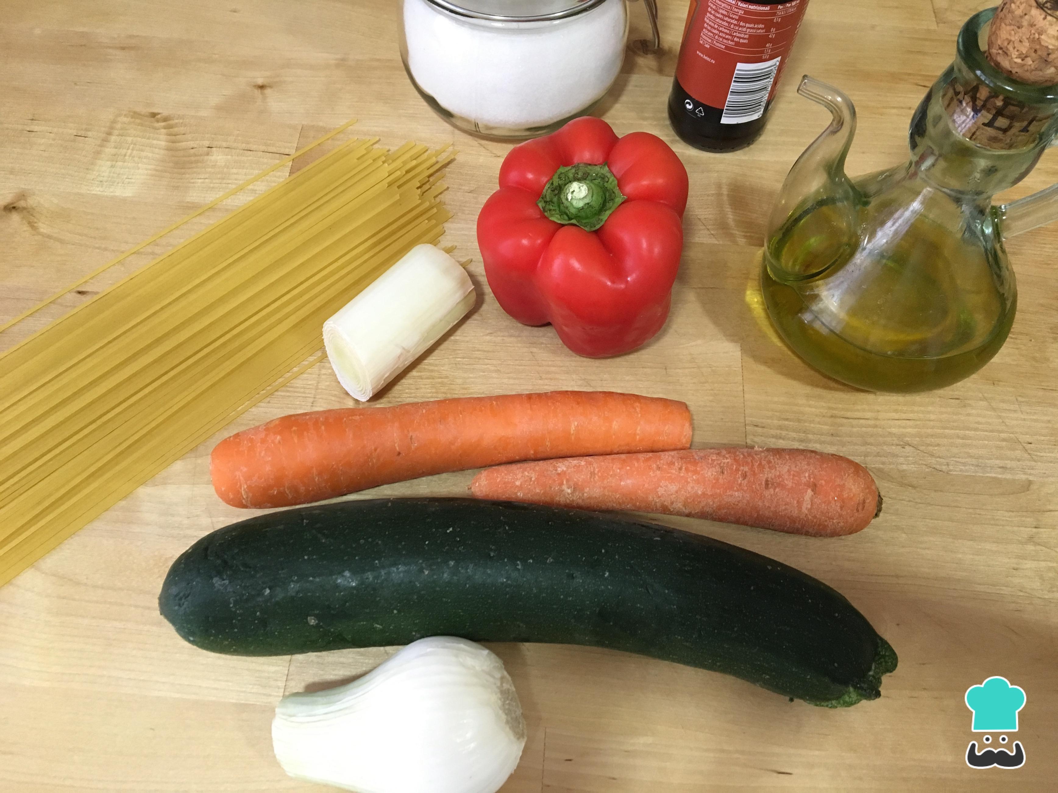 Reunimos todos los ingredientes para preparar los espaguetis con verduras y soja.