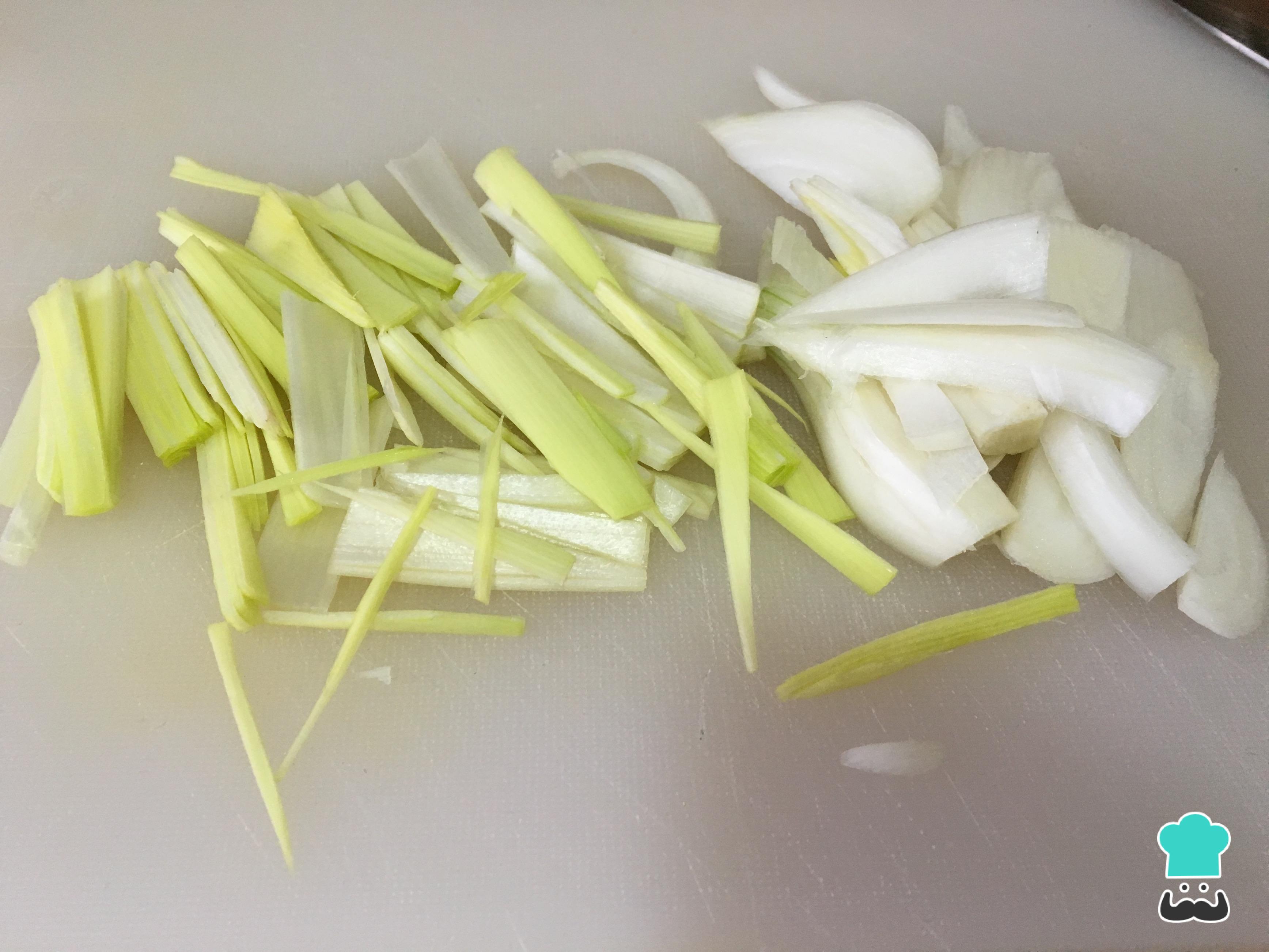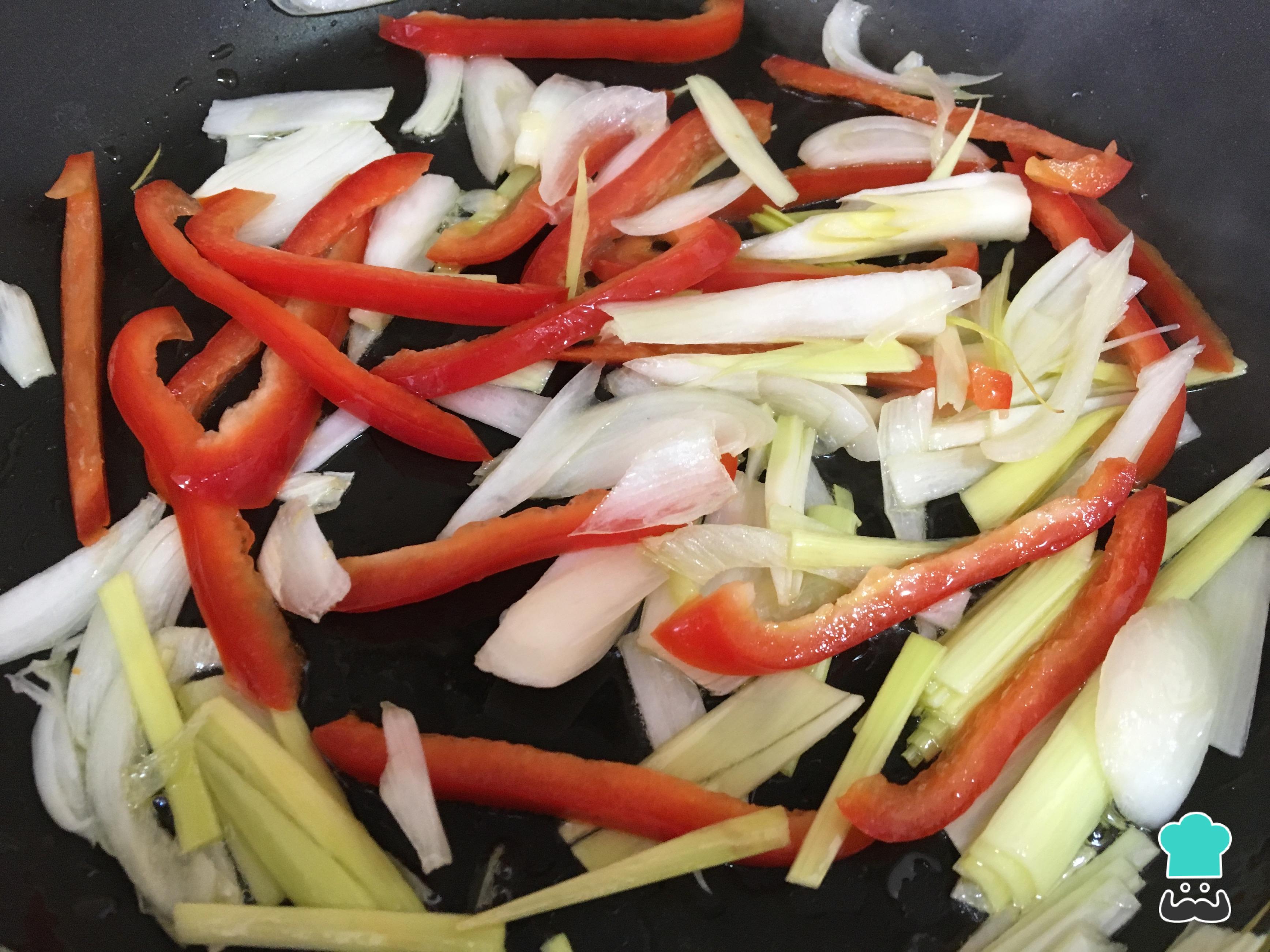 Cortamos el puerro y la cebolleta en forma de bastoncitos no demasiado finos, como indicamos en la imagen. Sofreímos estas verduras en la sartén con un poco de aceite de oliva y dejamos cocinar durante 2 minutos.