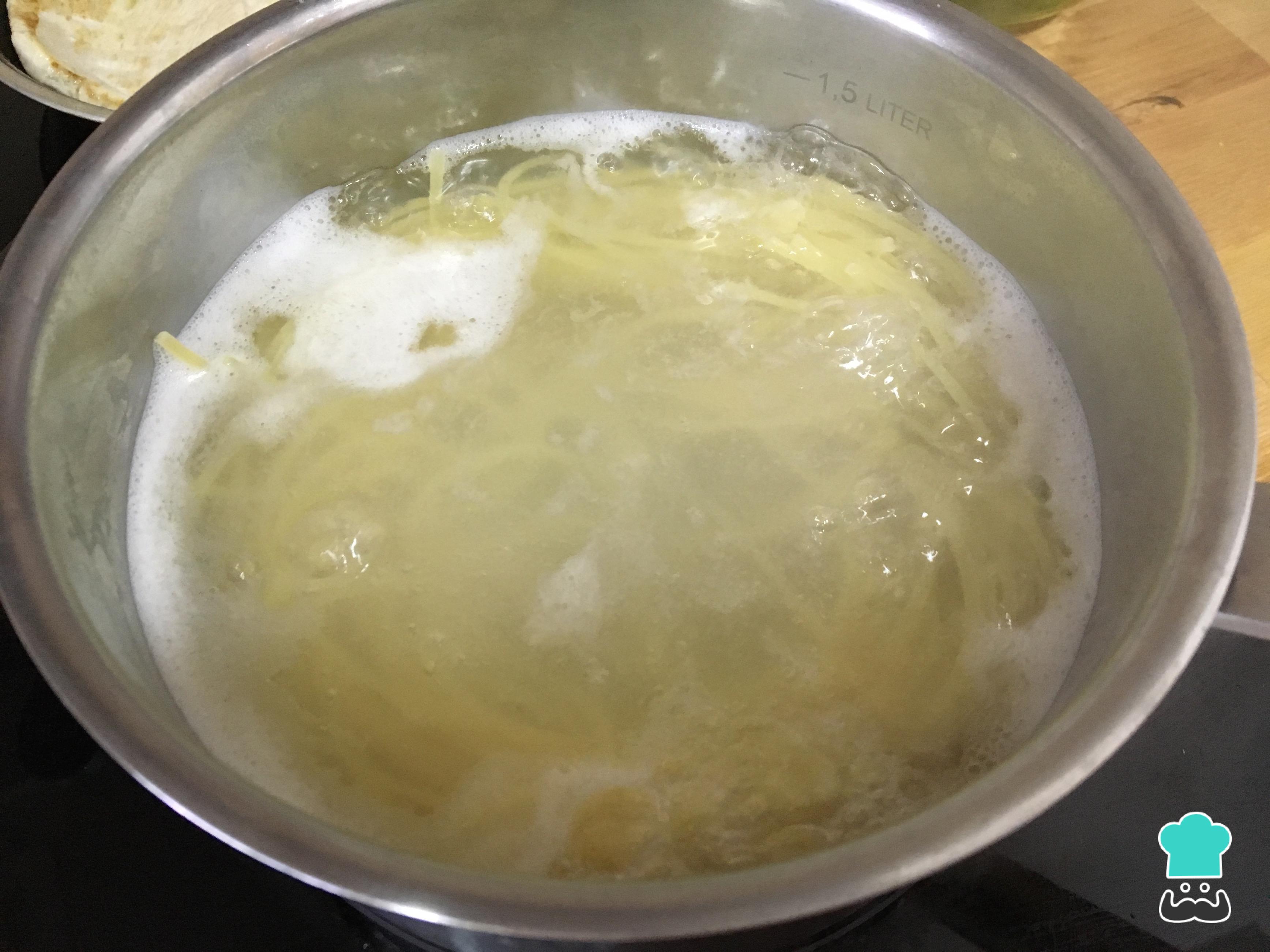 Mientras tanto, cocemos los espaguetis en abundante agua hirviendo con un poco de sal.