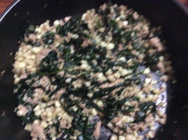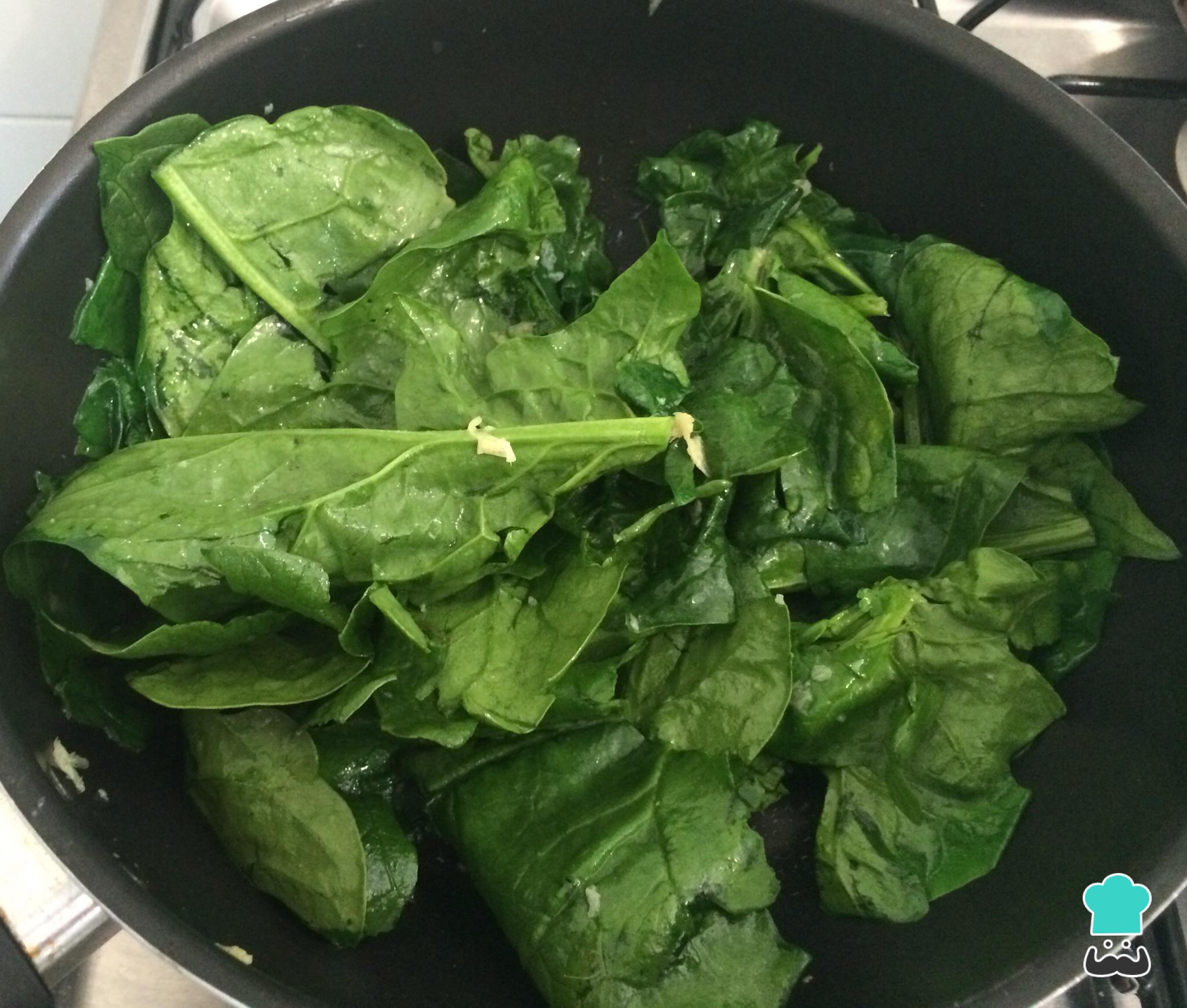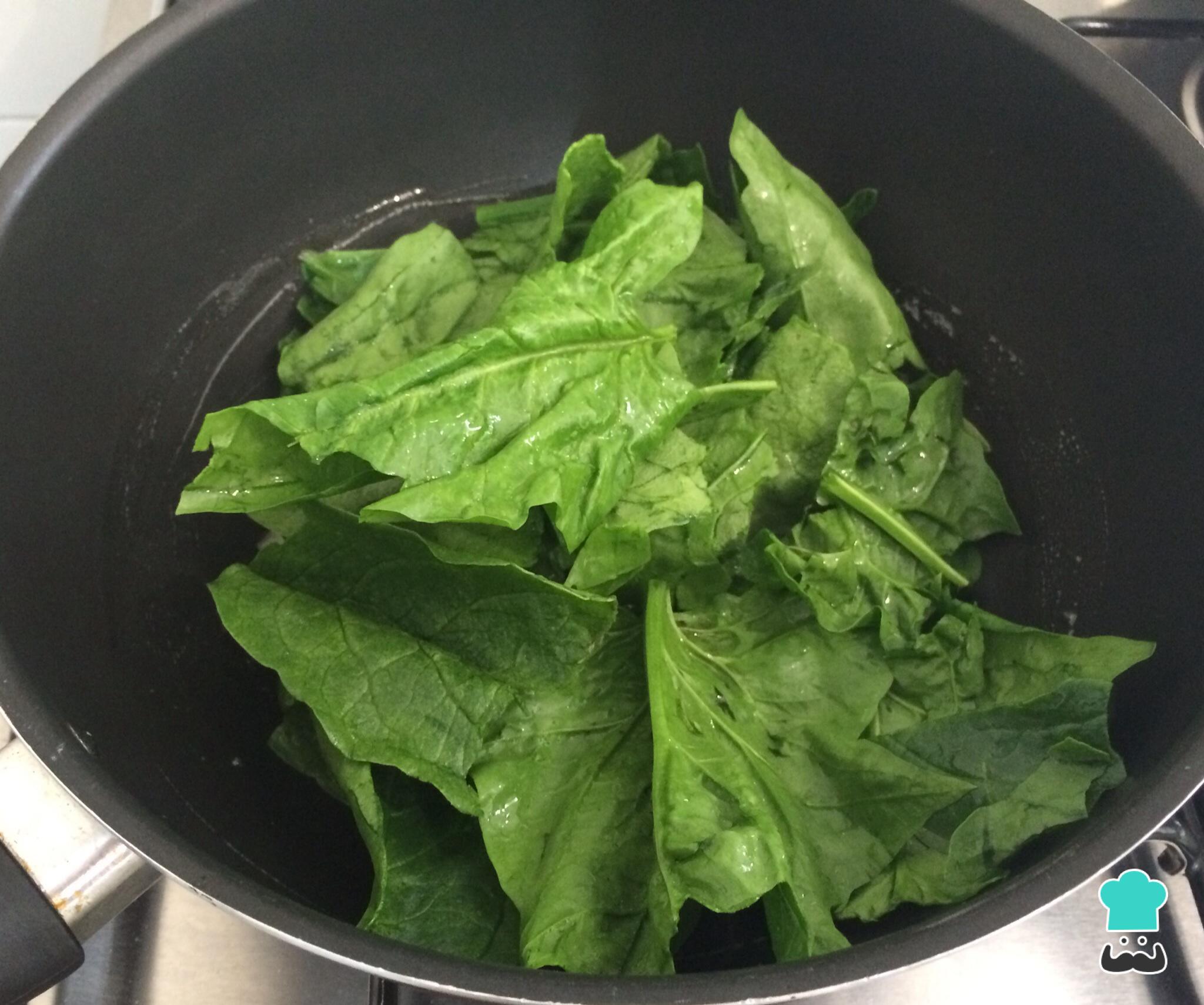 Lavar muy bien las hojas de espinaca, secar una por una, trocear un poco y añadir al sartén de a poco.