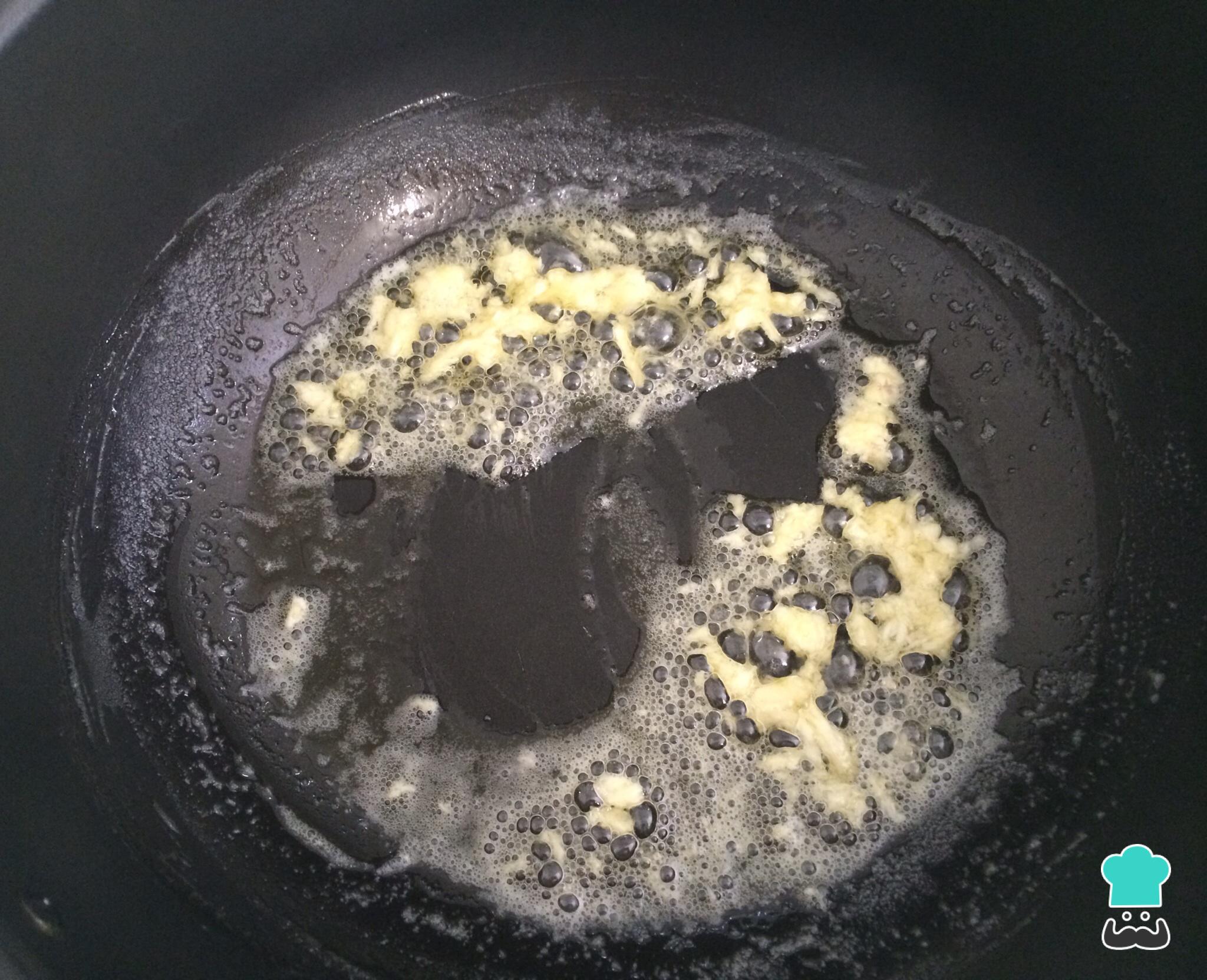 En un sartén derretir la mantequilla a fuego bajo, añadir el ajo macerado y cocinar durante 2 minutos, revolver constantemente para evitar que se queme el ajo.